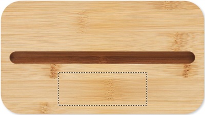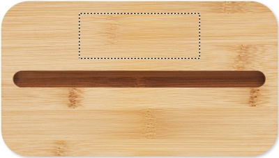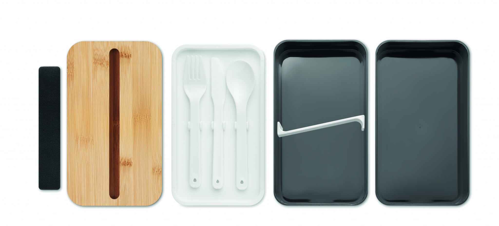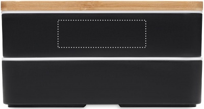 Recycled PP two-tier lunch box with removable divider and 3 cutlery utensils with attachable polyester band with bamboo lid. The lid has a phone stand functionality. Capacity: 400 ml (2x). Bamboo is a natural product, there may be slight variations in colour and size per item, which can affect the final decoration outcome.