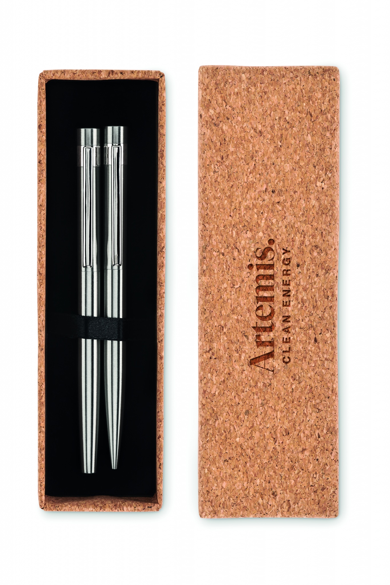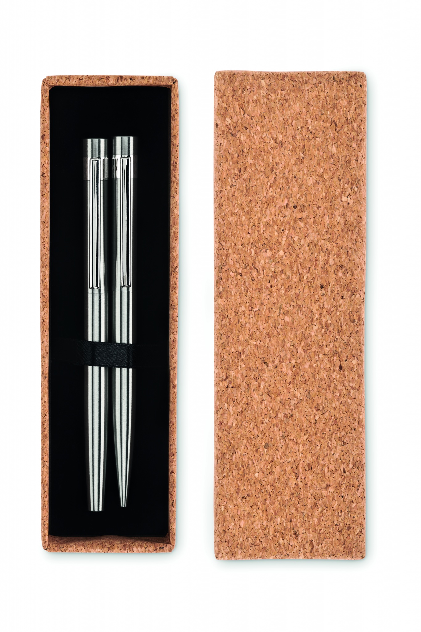 Recycled stainless steel pen set with ball pen and roller ball. Presented in matching cork box. Blue and black ink respectively. Cork is 100% natural material. Due to its structural nature and surface porosity the final print result per item may have deviations.