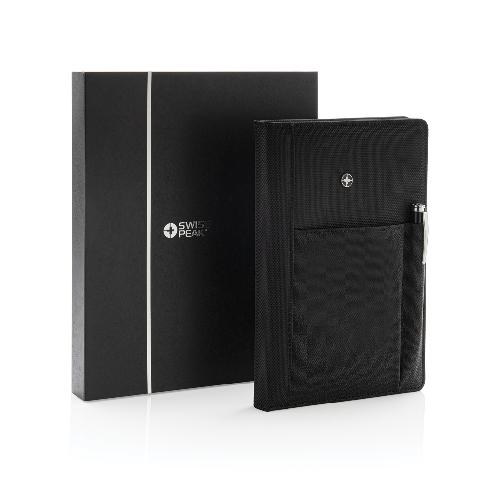 Executive 1680D and 600D polyester notebook cover with pen. Including removable notebook with 192 pages of 80g/m2 paper inside. Pocket on the cover can hold pen, cards, cash, mobile phone etc. Packed in Swiss Peak giftbox.