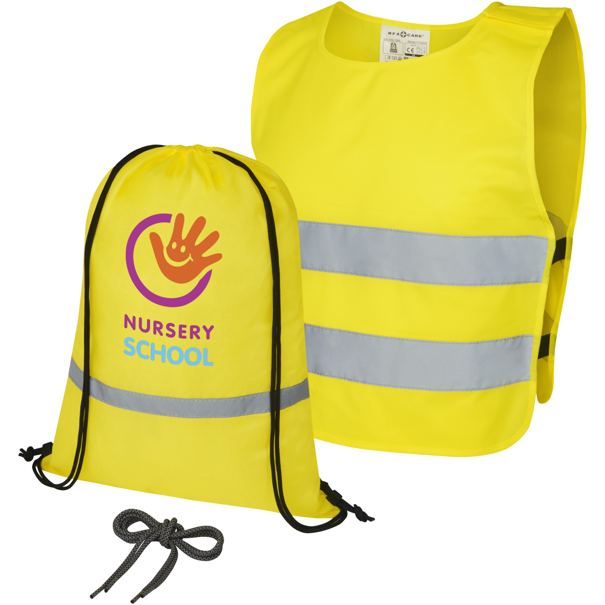 Complete safety and visibility set for children aged 7 to 12 years. This back-to-school giveaway set contains a reflective drawstring backpack, safety vest, and a set of reflective shoelaces. The reflective backpack has a large compartment with drawstring closure and is tested and certified under regulation EN 1150:1999. The high visibility vest in XS size is suitable for children aged 7-12 years with a height between 104-121 cm. Large decoration area on the front and on the back of the vest. On the shoulder and the bottom elastic bands there are hook & loop closures, that offers extra safety and makes the vest easy to put on. The elastic bands on the other side makes it stretchable allowing for easy wearing on thick coats. The vest is tested and certified under regulation EN 1150:1999. It also adheres to the PPE guidelines on application of Regulation (EU) 2016/425 Personal Protective Equipment Category II. The reflective shoelaces are 80 cm long with sturdy ends on both sides for easy placing into any shoe.