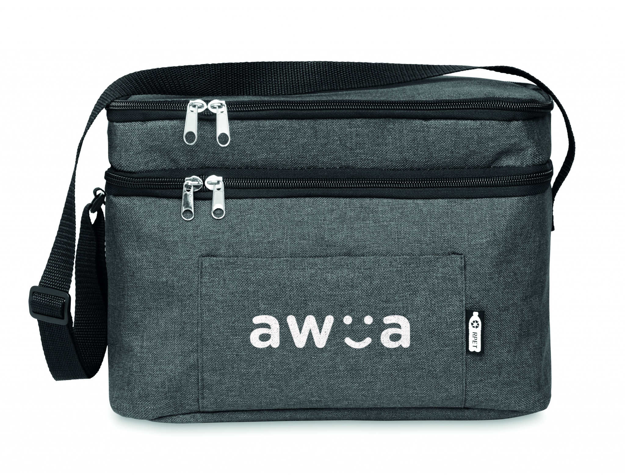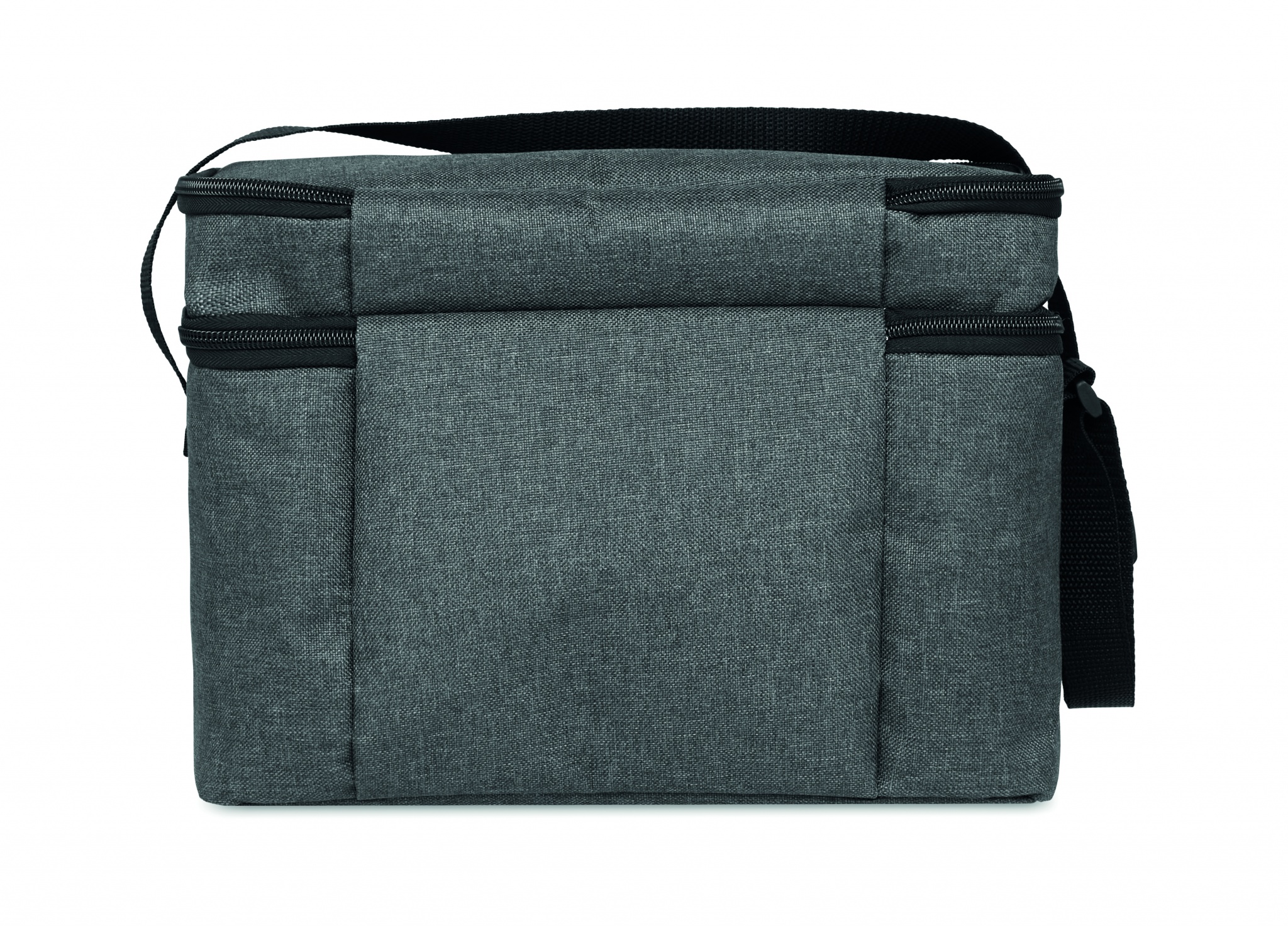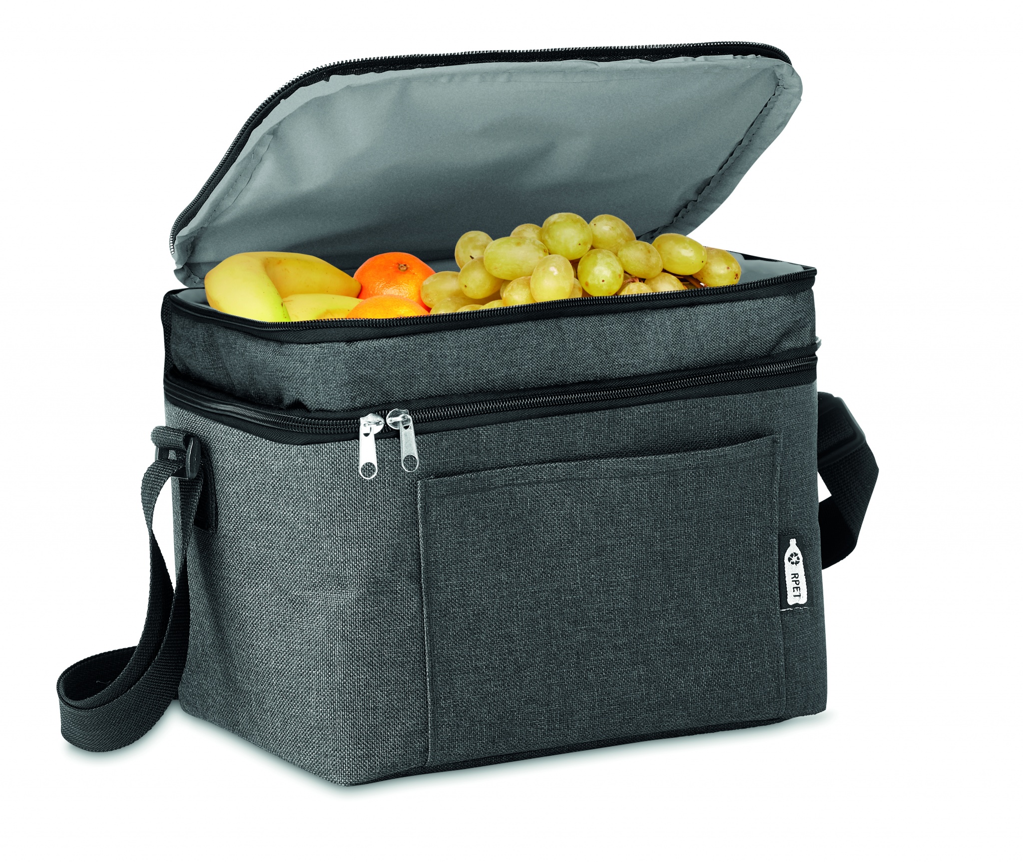2 tone 600D RPET cooler bag with 2 compartments and PEVA lining. Adjustable shoulder strap and front pocket. Isolation material: 0.15mm PEVA + 3mm foam.