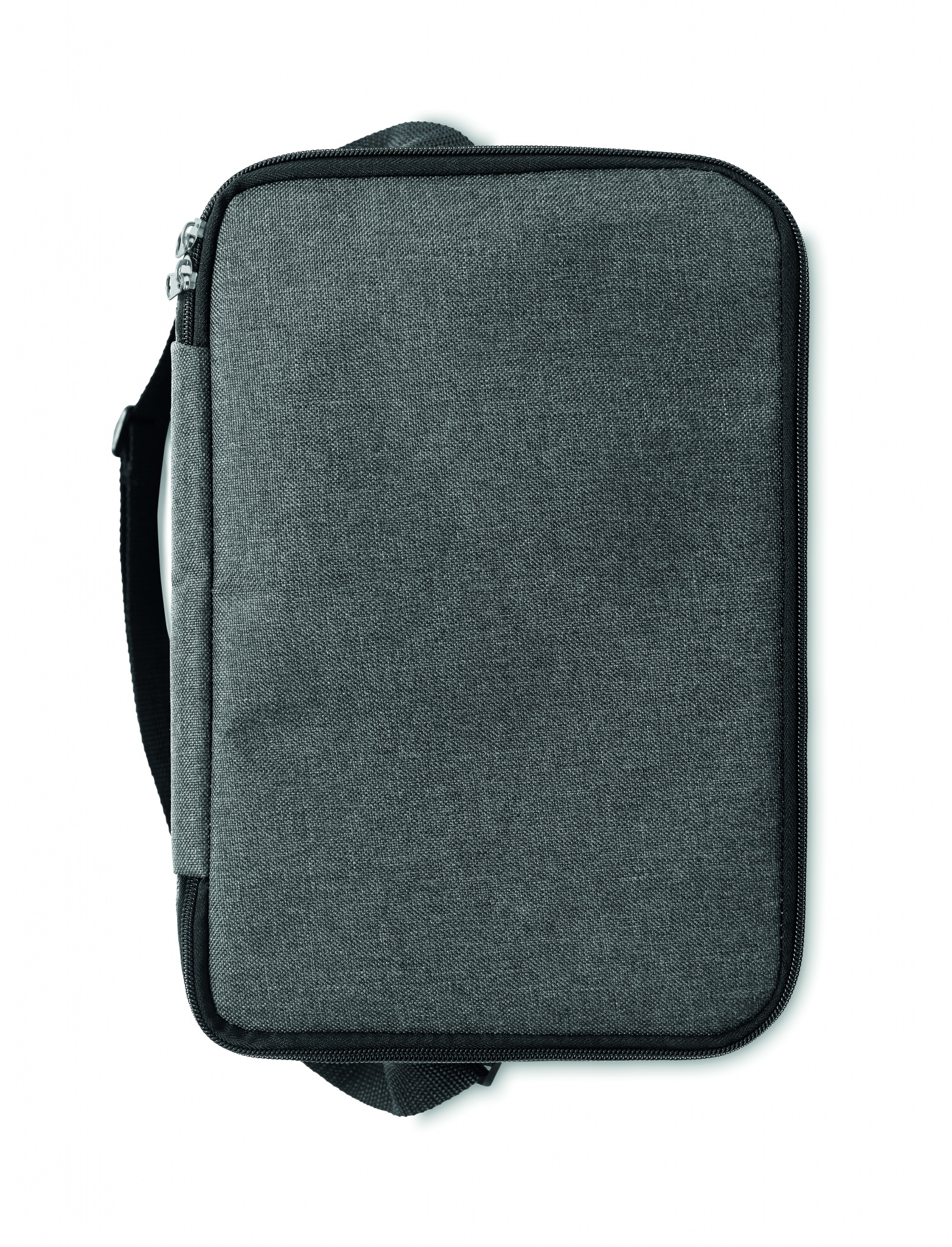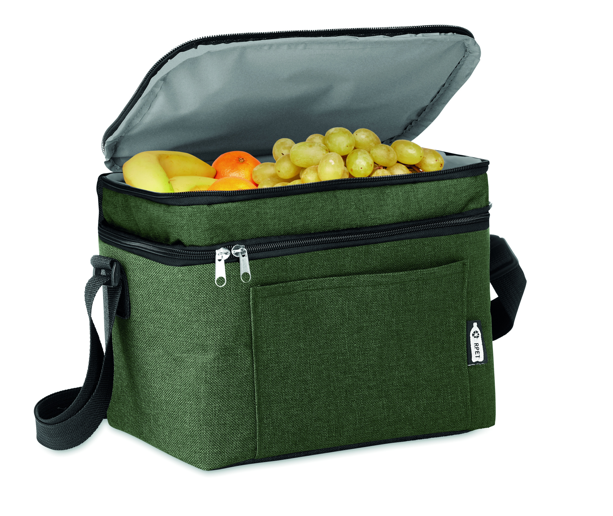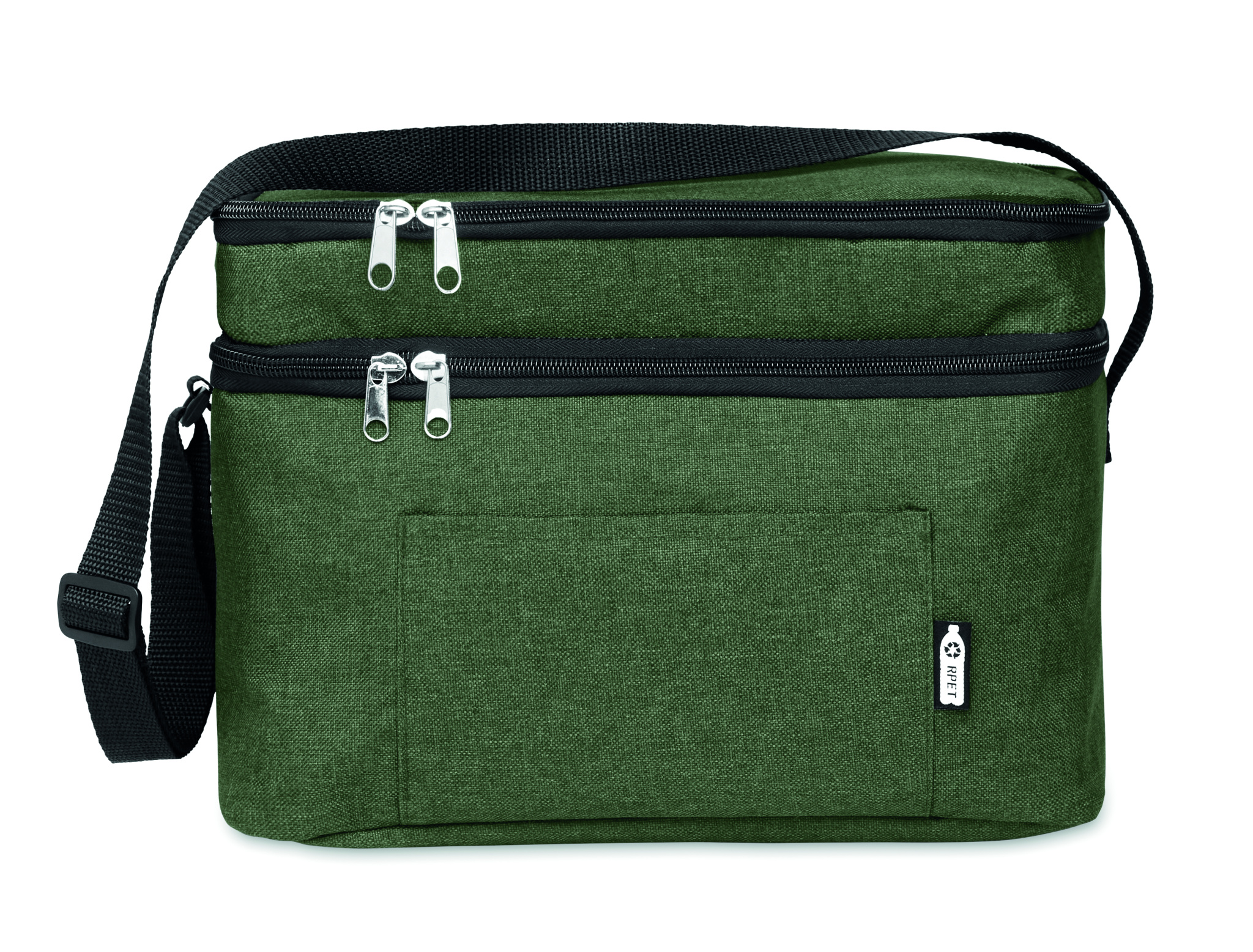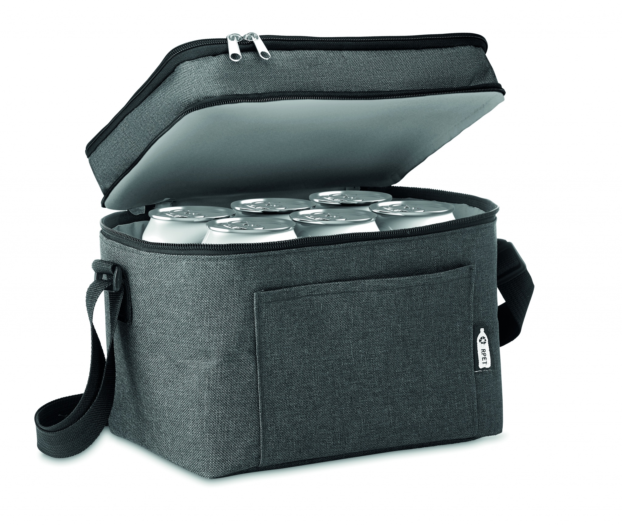 2 tone 600D RPET cooler bag with 2 compartments and PEVA lining. Adjustable shoulder strap and front pocket. Isolation material: 0.15mm PEVA + 3mm foam.