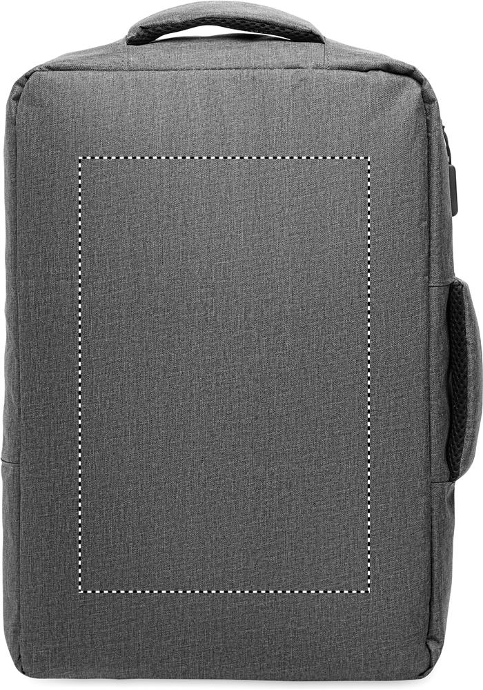 A safe 15-inch laptop backpack made of 300D RPET with a 210D RPET lining and customizable printing.