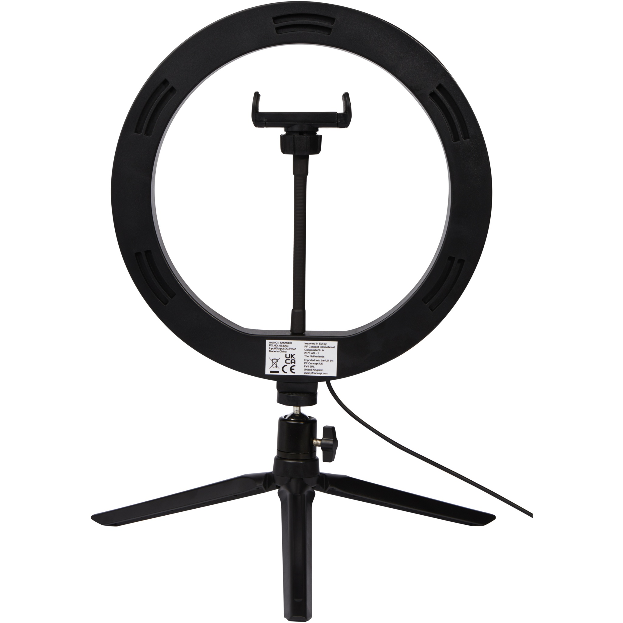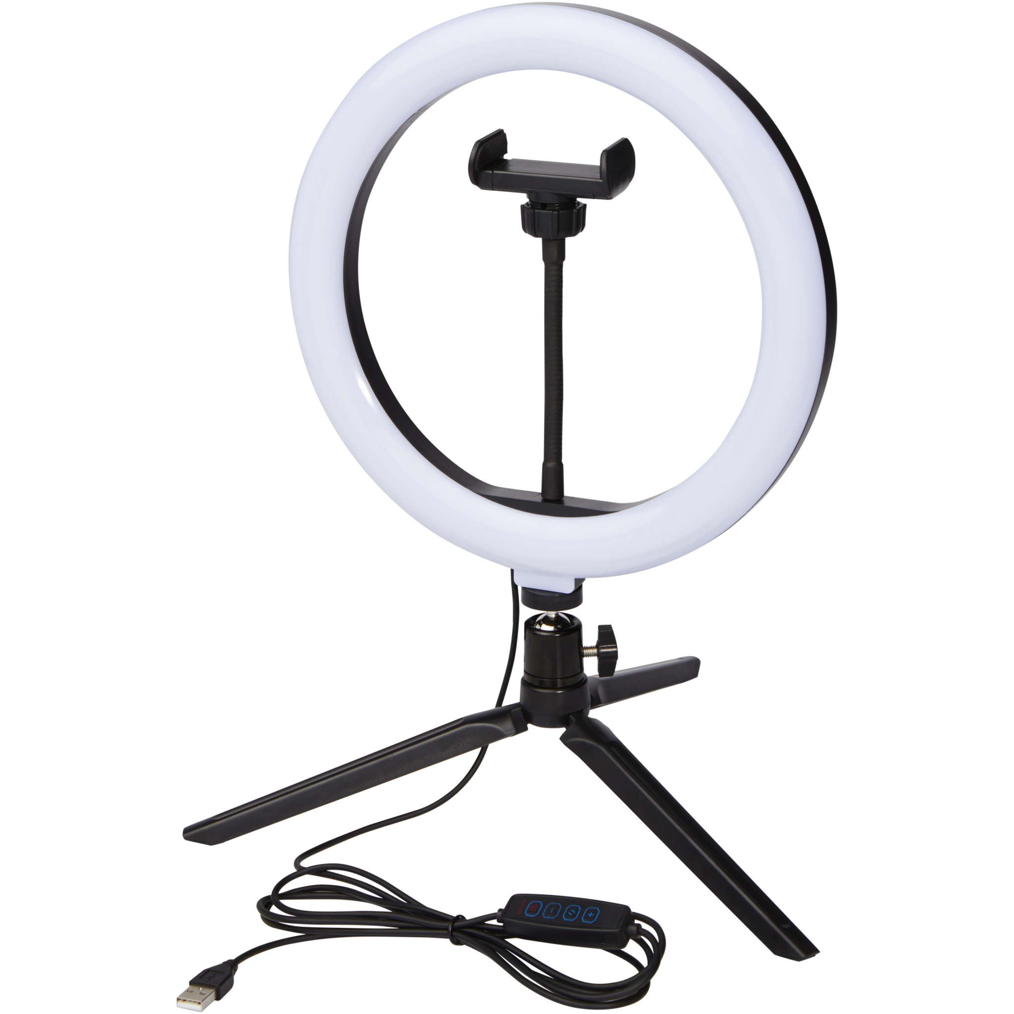 LED ring light (23 cm) with a tripod stand and phone holder, the ideal gadget for any photographer/YouTuber/Vlogger/content creator that regularly do streams or broadcasts. The ring light will cast even light on your face without any hard shadows. The lamp has 120 warm white LEDs that can be adjusted to 10 different brightness levels for the perfect light exposure. Delivered in an Avenue gift box.