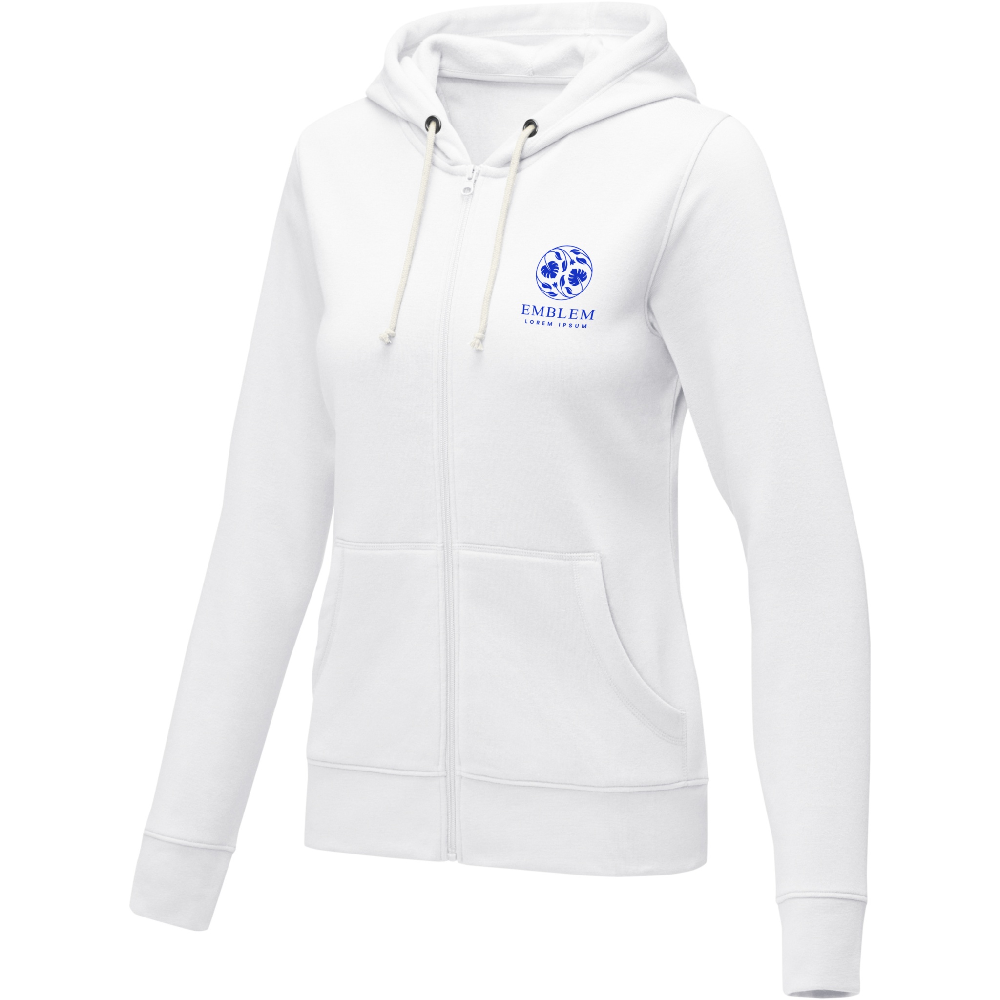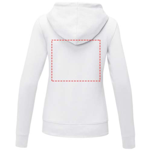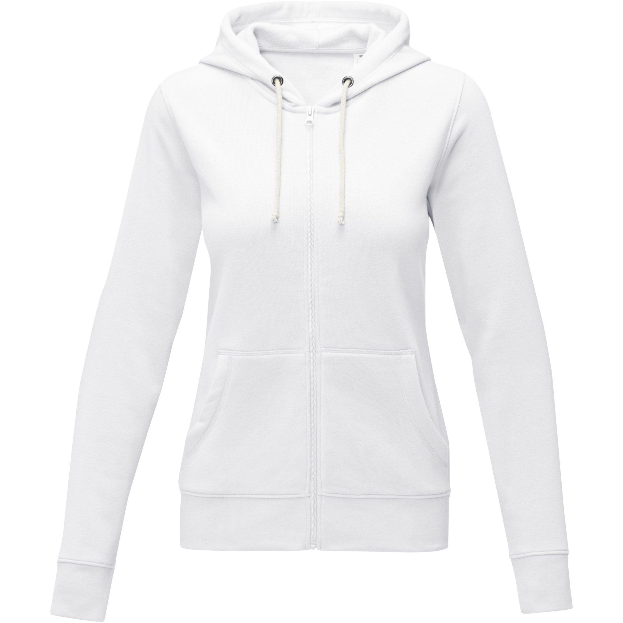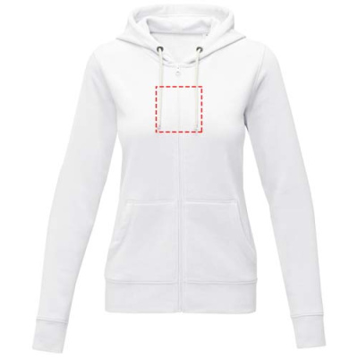 The Theron women's full zip hoodie – where style meets comfort in perfect harmony. This hoodie is a true embodiment of classic design. Additionally, the interior custom branding options allow personalised branding or customisation inside the hoodie. A kangaroo pocket combines convenience with a modern aesthetic. The flat knit rib bottom hem and cuffs guarantee a secure fit, while the brushed interior maximizes softness. The 240 g/m² fabric, blend of cotton and polyester, promises warmth and durability. Elevate your wardrobe with the Theron full zip hoodie. This hoodie is designed with a fitted shape for a feminine look.