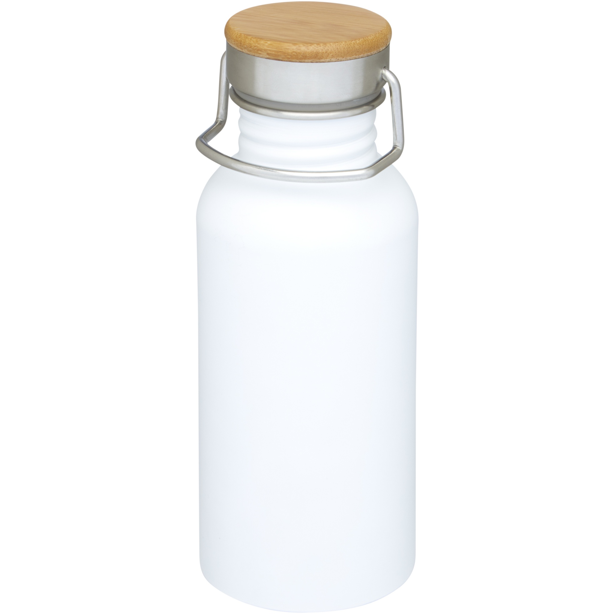 Single-walled stainless steel bottle with screw-on lid. The lid features a bamboo top, as well as a handle for easy carrying. Volume capacity is 550 ml. Presented in an Avenue gift box.