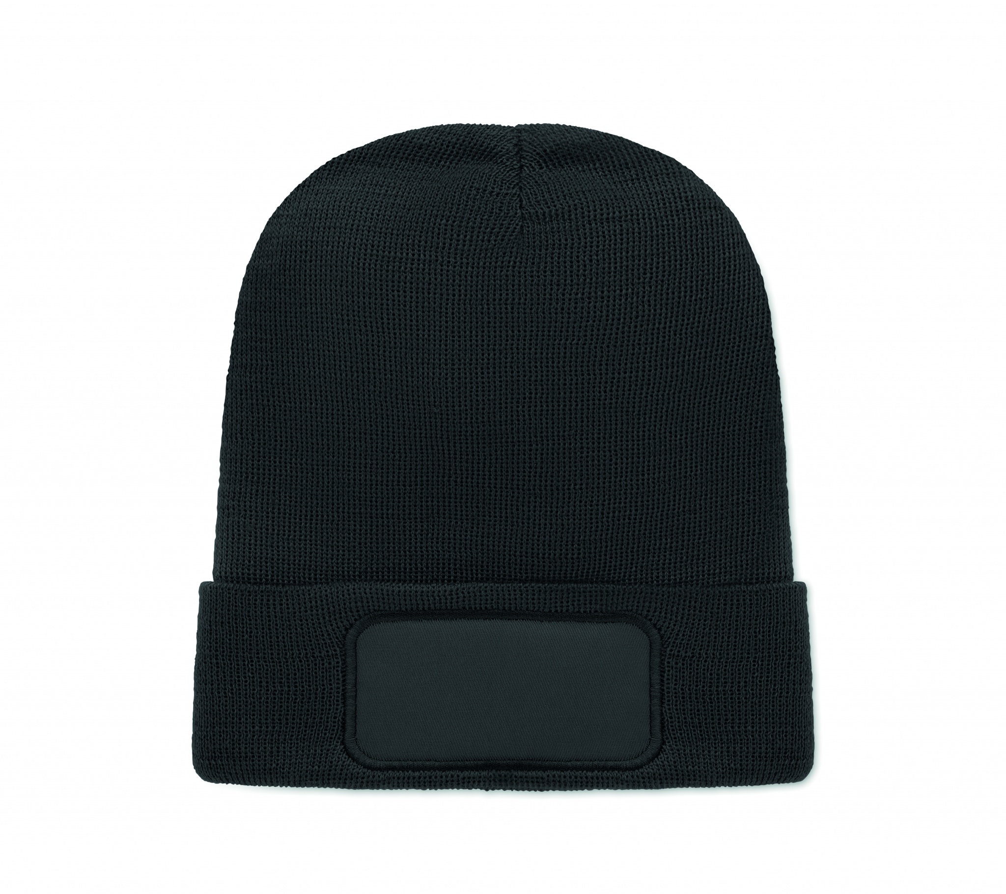 Unisex knitted beanie in soft stretchable RPET polyester with cuff and patch.