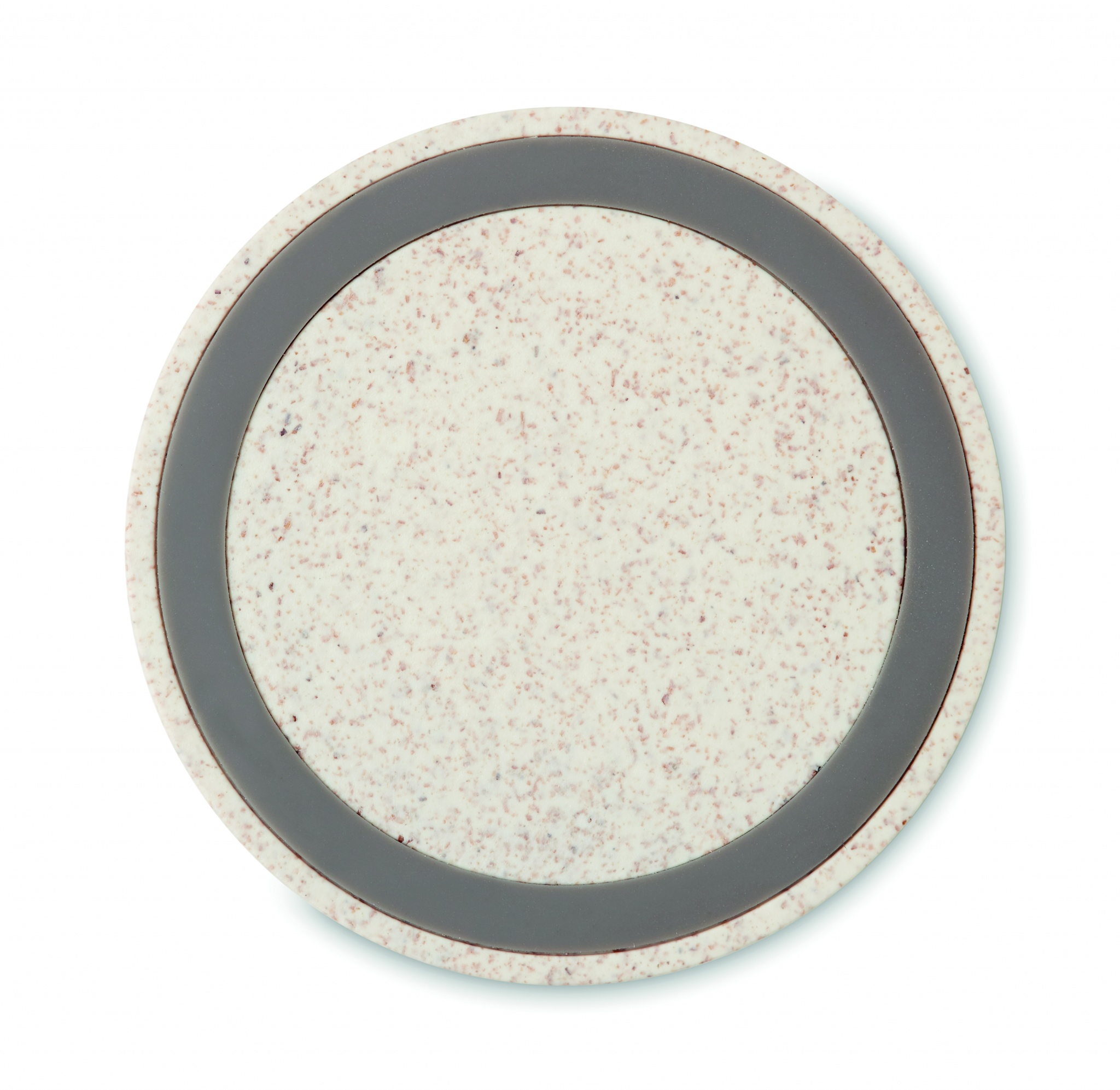 Wireless charger in wheat straw (35%) and ABS (65%). Connect device, place smartphone on it to begin charging. Output: DC5V/1A (5W). Compatible with latest Androids, iPhone® 8, 8S and X and newer.