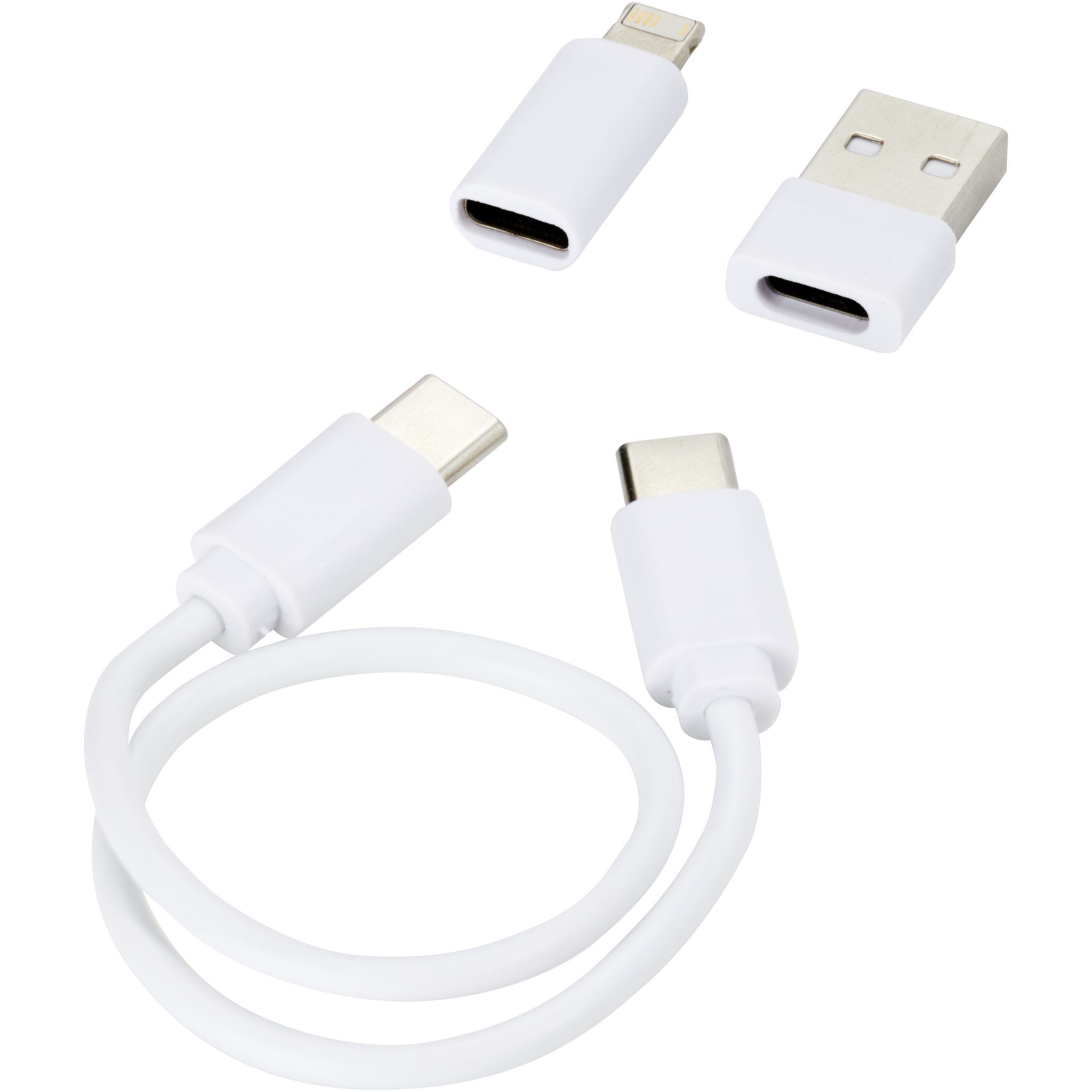 Modular data transfer and charging cable made from recycled plastic, delivered in an elegant storage box. The cable offers multiple charging solutions: Type-C and USB-A input, and Type-C/iOS/micro USB output. Thanks to all of these adapters and connectors, this cable allows you to charge most smartphones, cameras, power banks, earbuds etc. The cable has a maximum output power of 2A. Features an eject pin that comes in handy anytime you need to take out your phone’s SIM card. The storage box also has room to store a micro SD memory card as well as a nano SIM card, making this the perfect travel accessory. Cable length: 28 cm. Supplied in a 100% recycled kraft paper envelope.