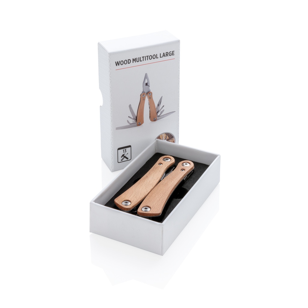 Strong and durable multitool with 13 functions. With beech wood case and high quality stainless steel tools. Tools include: Long nose pliers, standard pliers, wire cutters, serrated blade, bottle opener, large flat screwdriver, phillips screwdriver, knife, saw, small flat screwdriver, can opener, medium flat screwdriver, file. Packed in gift box.