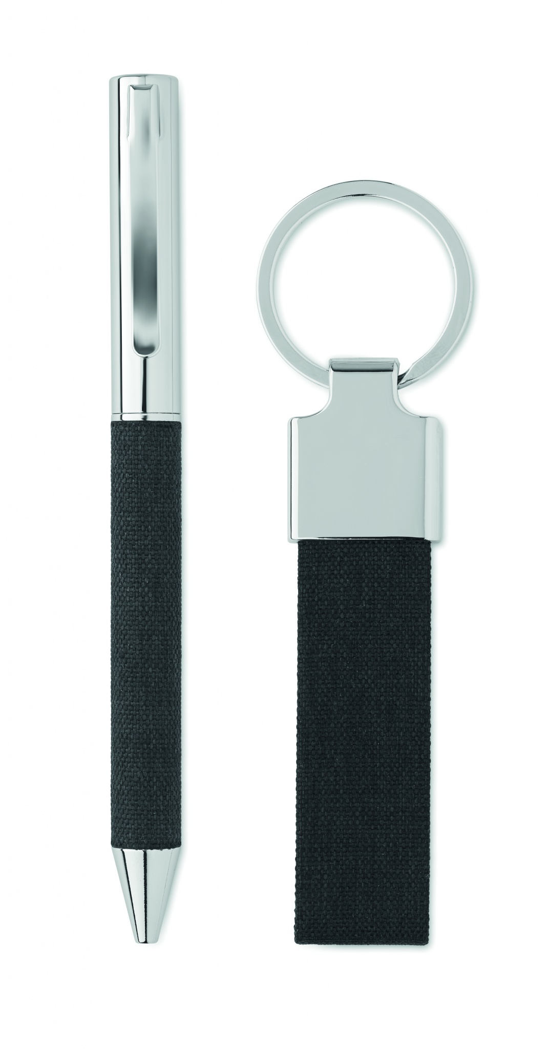 2-osaline kinkekomplekt kinkekarbis. Sisaldab metallist keermega pastapliiatsit RPET polüesterdetailide ja RPET polüester võtmehoidjaga. Sinine tint.