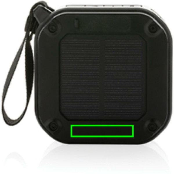 Võimas 3 W juhtmevaba kõlar koos integreeritud päikesepaneeliga tagaküljel, valmistatud RCS-sertifikaadiga taaskasutatud ABS-ist. Taaskasutatud kogusisaldus: 38% eseme kogukaalust. RCS-sertifikaat tagab taaskasutatud materjalide täielikult sertifitseeritud tarneahela. Kõlar kasutab kvaliteetseid monokristallilisi päikesepaneele, mille konversioonimäär on 19%. Tasu määr sõltub tingimustest. Laadimiskiirus päikeseenergia: 5V/80mA. Kõlar on varustatud 400 mAh akuga, mis tagab kuni 5 tundi mänguaega ning BT5.3 sujuva ühenduse ja selge heli tagamiseks. Ühendusulatus kuni 10 meetrit. Kõnedele vastamiseks mikrofoni ja vastuvõtmisfunktsiooniga. Integreeritud 30 luumenine LED-valgustiga. Pakitud FSC mix FSC® karpi. Kaasa arvatud RCS-sertifikaadiga taaskasutatud TPE laadimiskaabel. Toode ja tarvikud 100% PVC-vaba. IPX 5 veekindel.