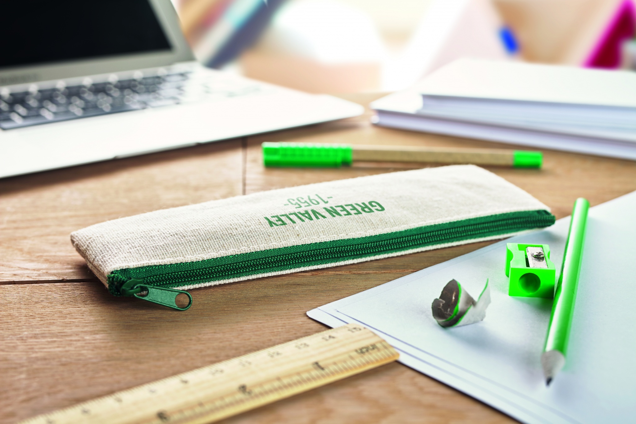 6-osaline statsionaarne komplekt. Kaasas džuudist ja puuvillast ümbris, puidust joonlaud, plastikust teritaja, kustutuskumm, paberist pliiats ja sinise tindiga pastapliiats.