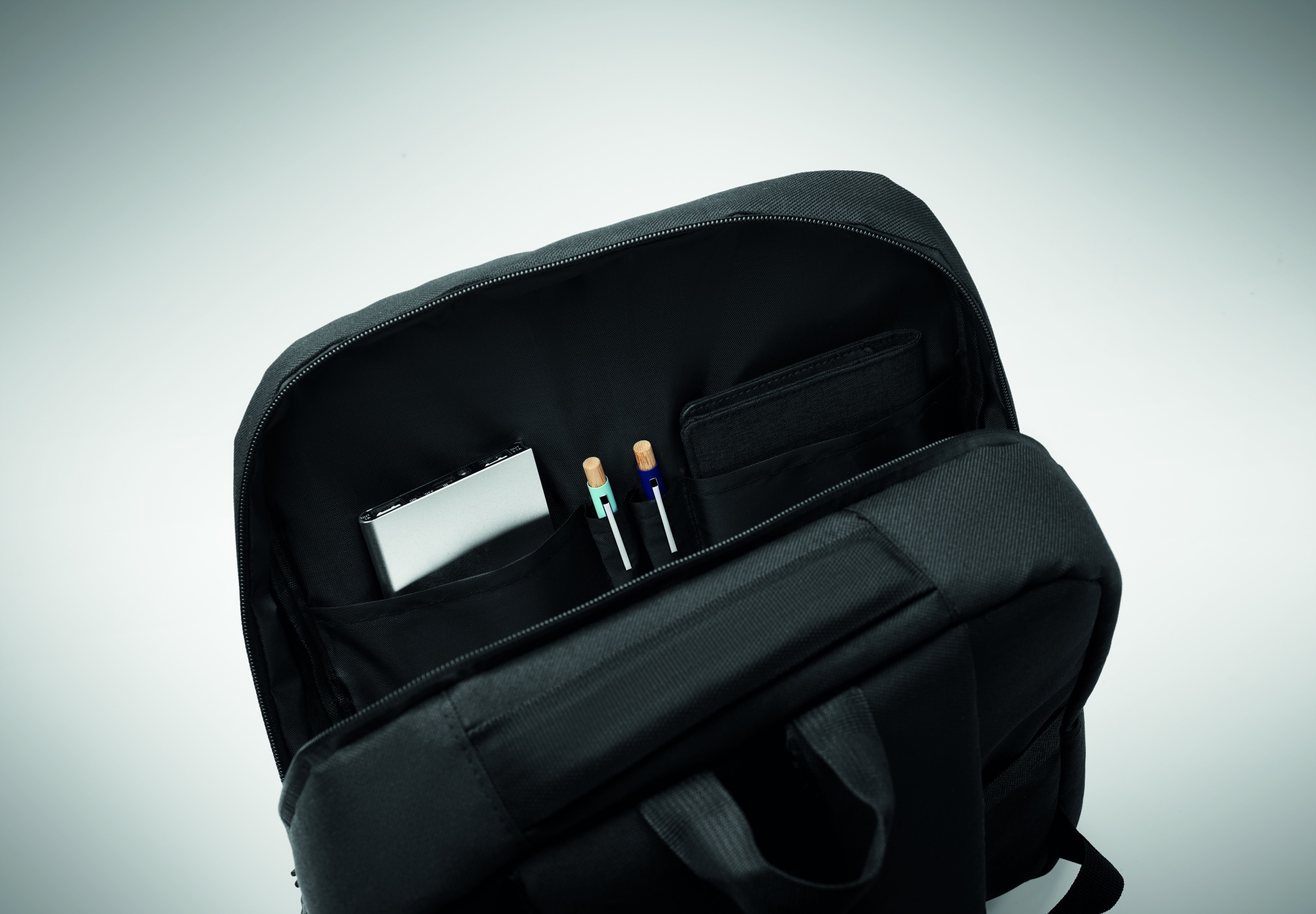 Õhuke seljakott 600D RPET polüestrist ja 210D voodriga. Sellel on 15-tolline sülearvuti sahtel, 10-tolline tahvelarvuti välimine lukuga tasku, 2 sisetaskut, 2 sisemist pliiatsitaskut, lukuga esitasku. 2 küljetaskut. Pehme polsterdatud selja- ja õlarihmad. Kohvri varrukas.