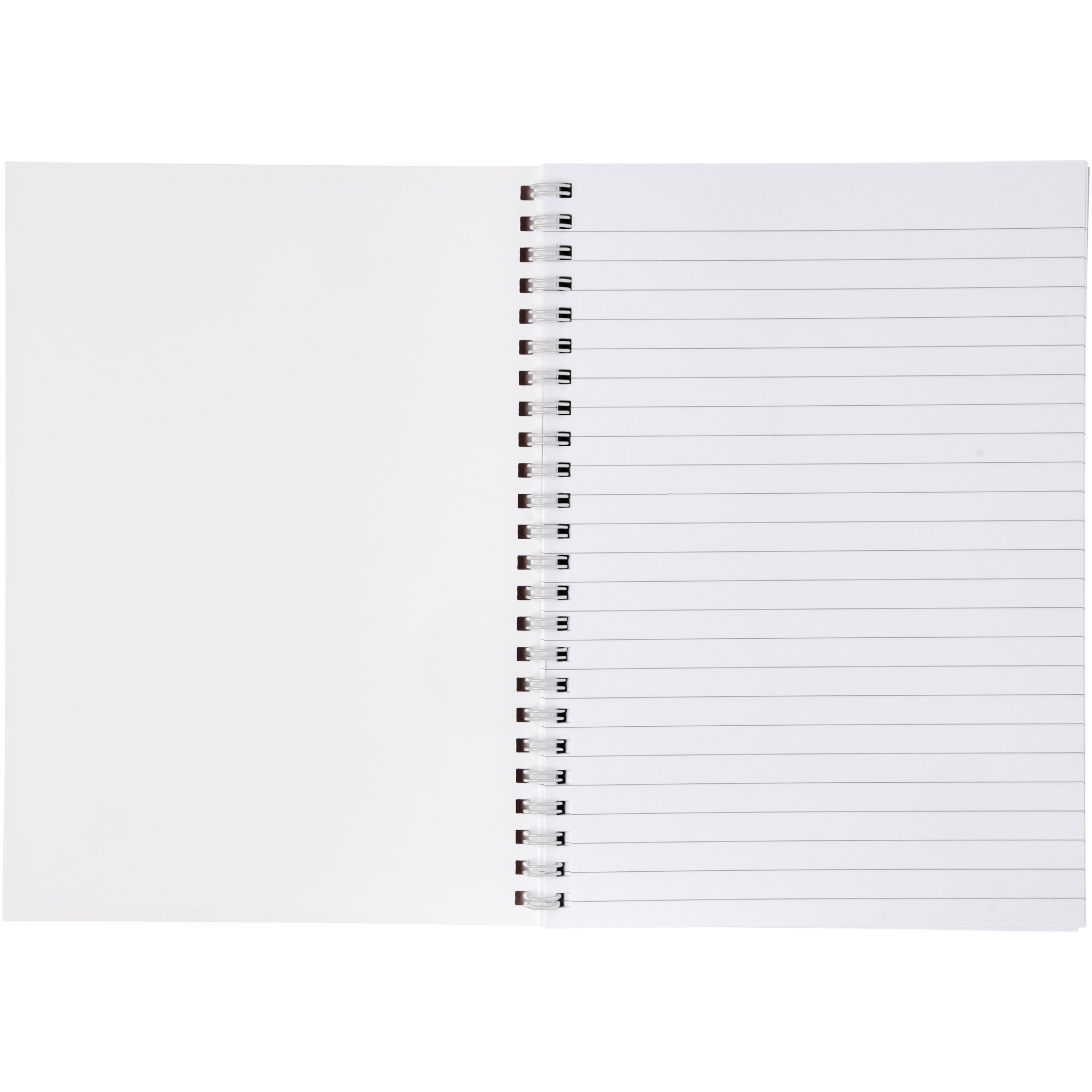 Desk-Mate® A5 spiraalmärkmik. Sisaldab 50 lehte tühja paberit (80 g/m2) ja esikaant (450 g/m2). Kate on rebenemis- ja veekindel. Must või valge värvi juhe. Saate kohandada selle mitmekülgse märkmiku lehti mis tahes kujundusega – nii et olenemata sellest, kas soovite joonelist paberit, ruute või punkte – kõik on võimalik!