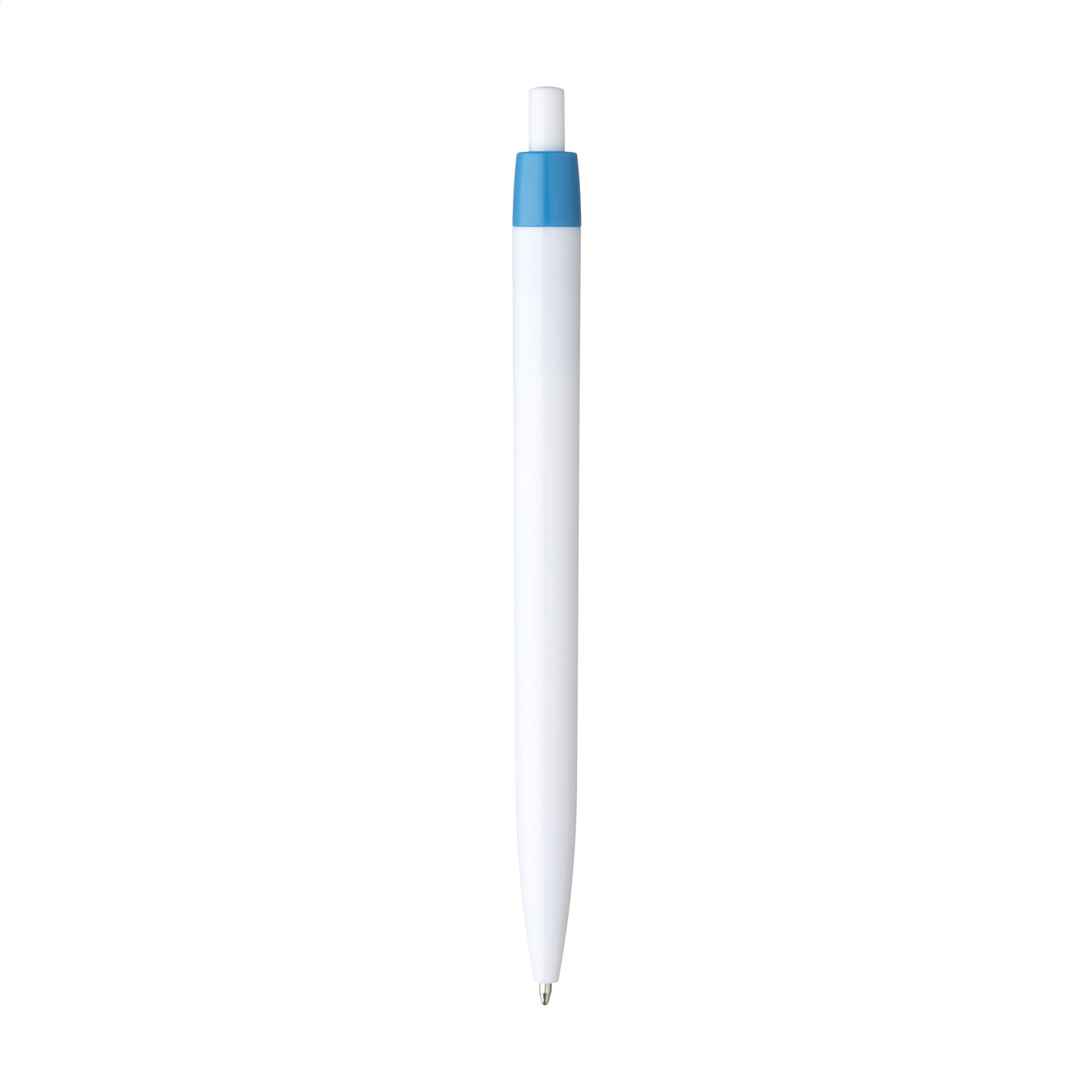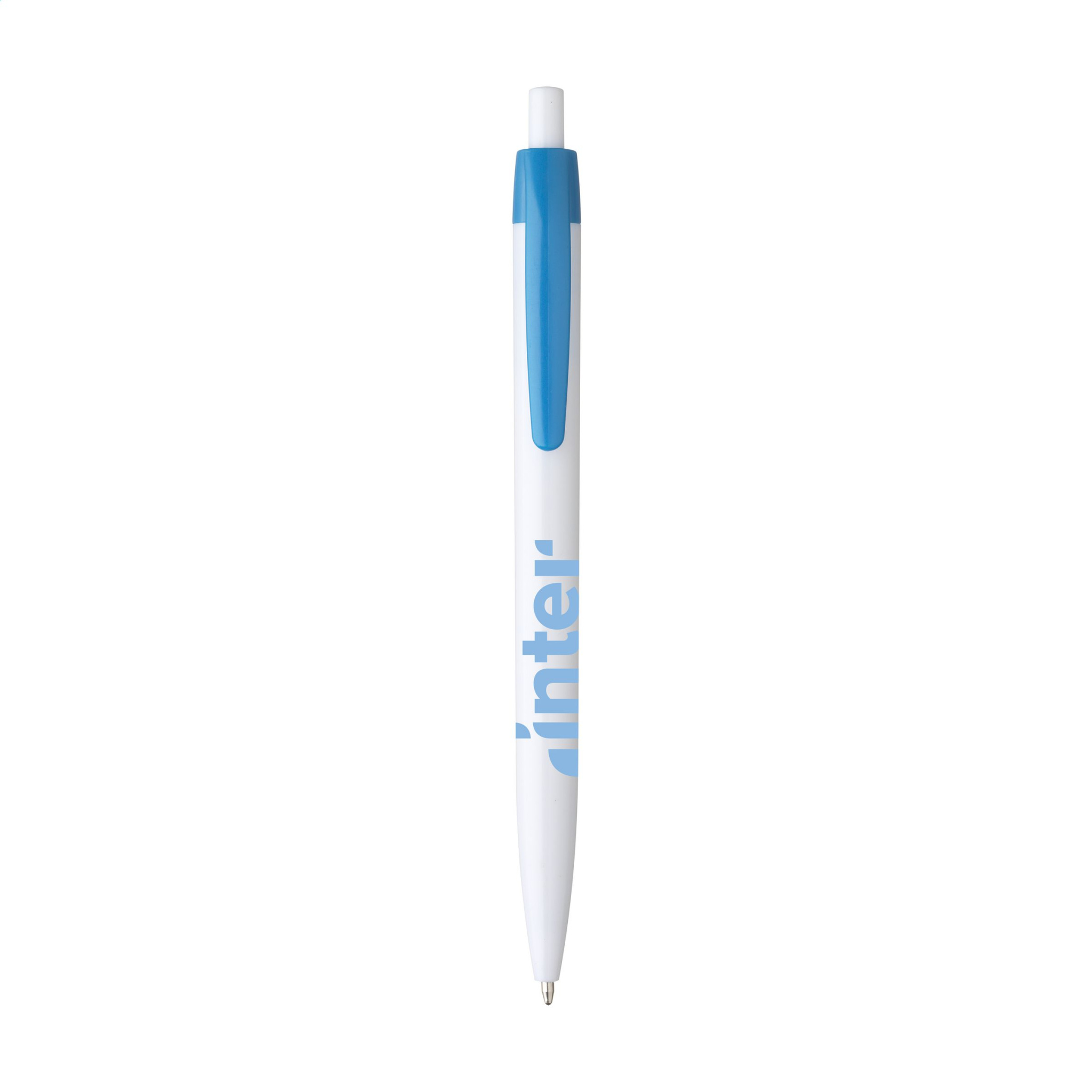 Ühes tükis pastapliiats sinise tindi ja valge toruga. Sellel pliiatsil on suur prindiala optimaalse kaubamärgi jaoks ning silmatorkav värviline klamber.