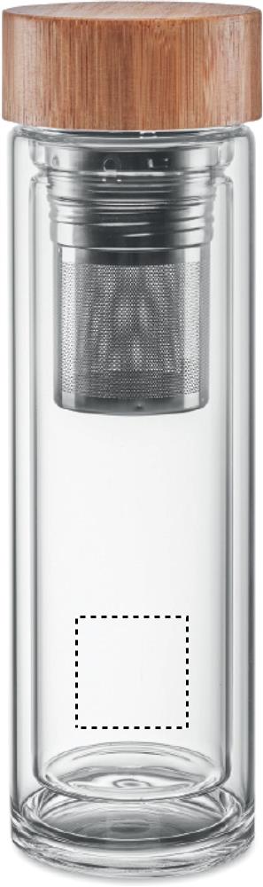 Topeltsein kõrge boorsilikaatklaasist pudelis ja bambusest kaas koos teetõmmisega. Mahutavus: 400 ml. Bambus on looduslik toode, ühe eseme värvis ja suuruses võib esineda väikesi erinevusi, mis võivad mõjutada lõppviimistlust. Lekkevaba. Boorsilikaatklaasile ei ole lasergraveerimine võimalik.