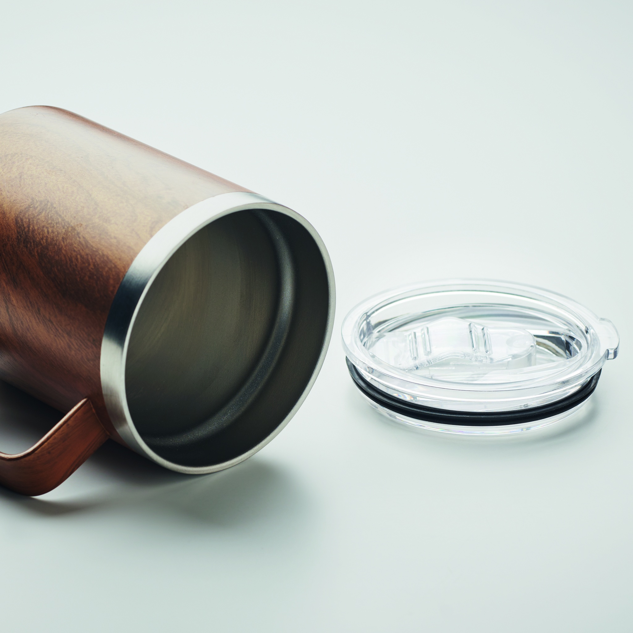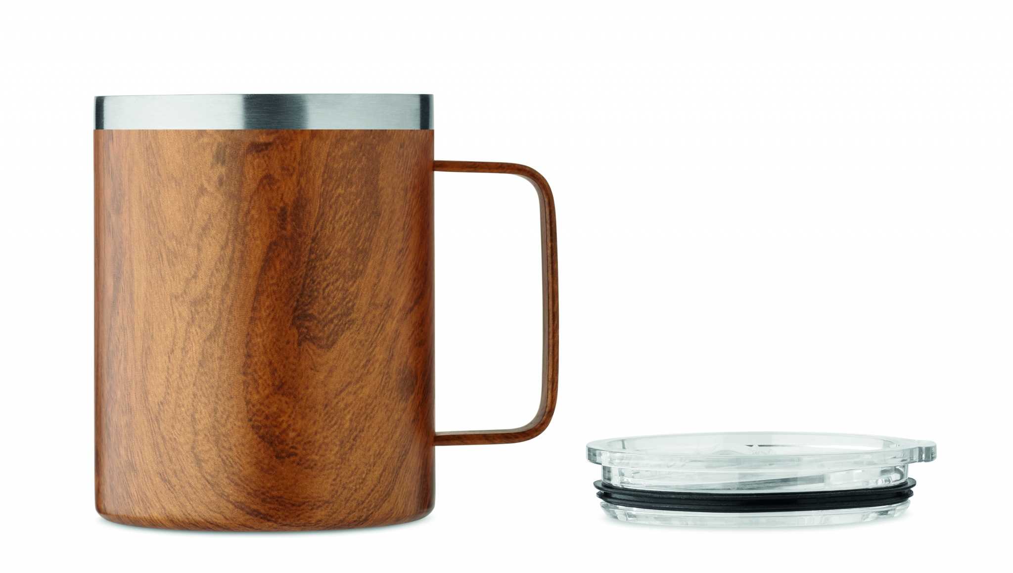 Kahekordse seinaga taaskasutatud roostevabast terasest (90% taaskasutatud roostevabast terasest ja 10% roostevabast terasest) puidust välimusega ja libiseva lonksuava kaanega kruus. Mahutavus: 300 ml.