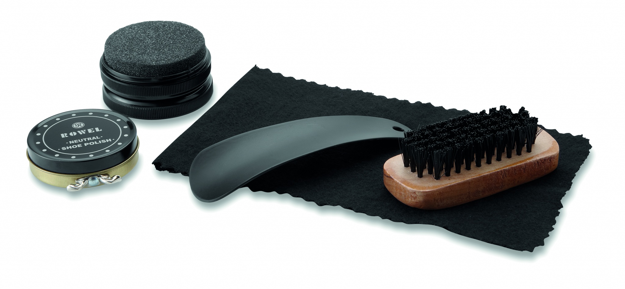 5-osaline luksuslik kingakreemi komplekt kinkekarbis. Sellesse komplekti kuuluvad must kingalapp, must kingasarve, puidust kingahari, kinga läikiv käsn ja neutraalses värvitoonis lakk.