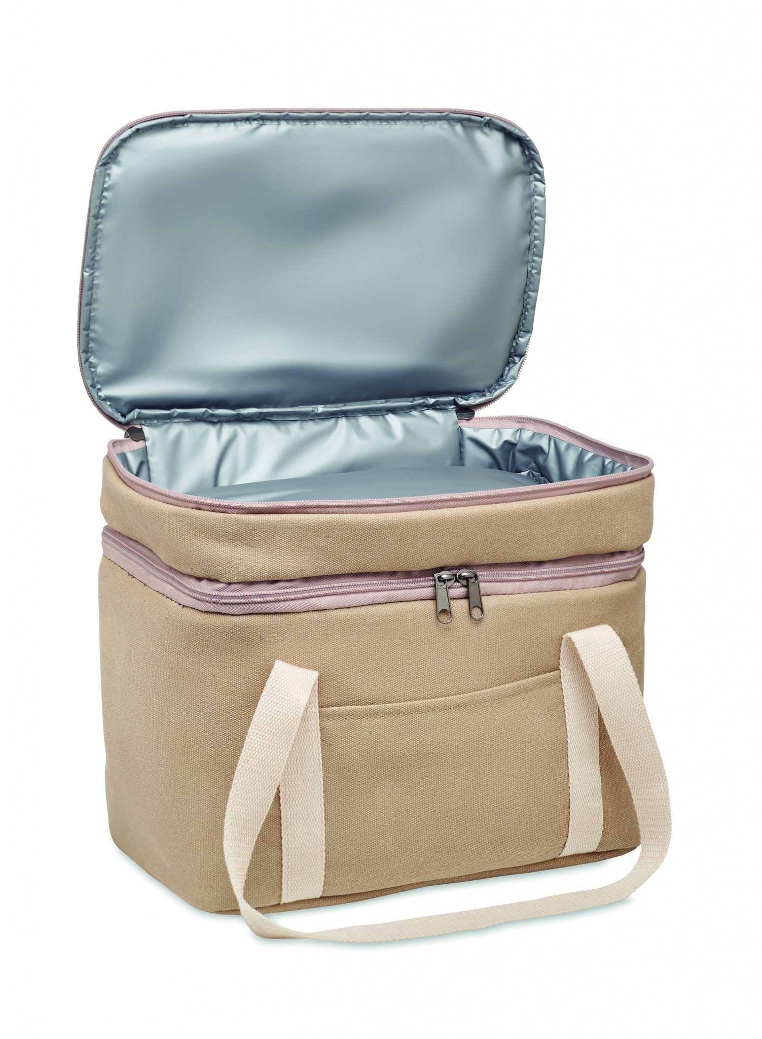 Kahe sektsiooniga pestud lõuendist jahutuskott puuvillase rihmaga. 320 gr/m². Isolatsioon: 15C PEVA 6mm PE vahuga.