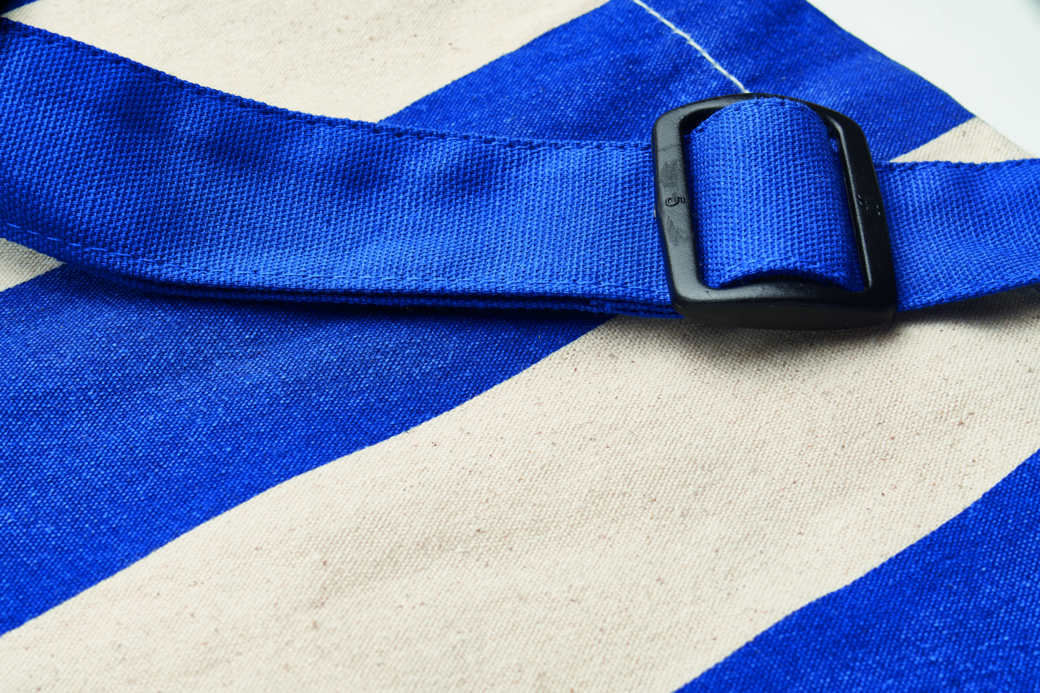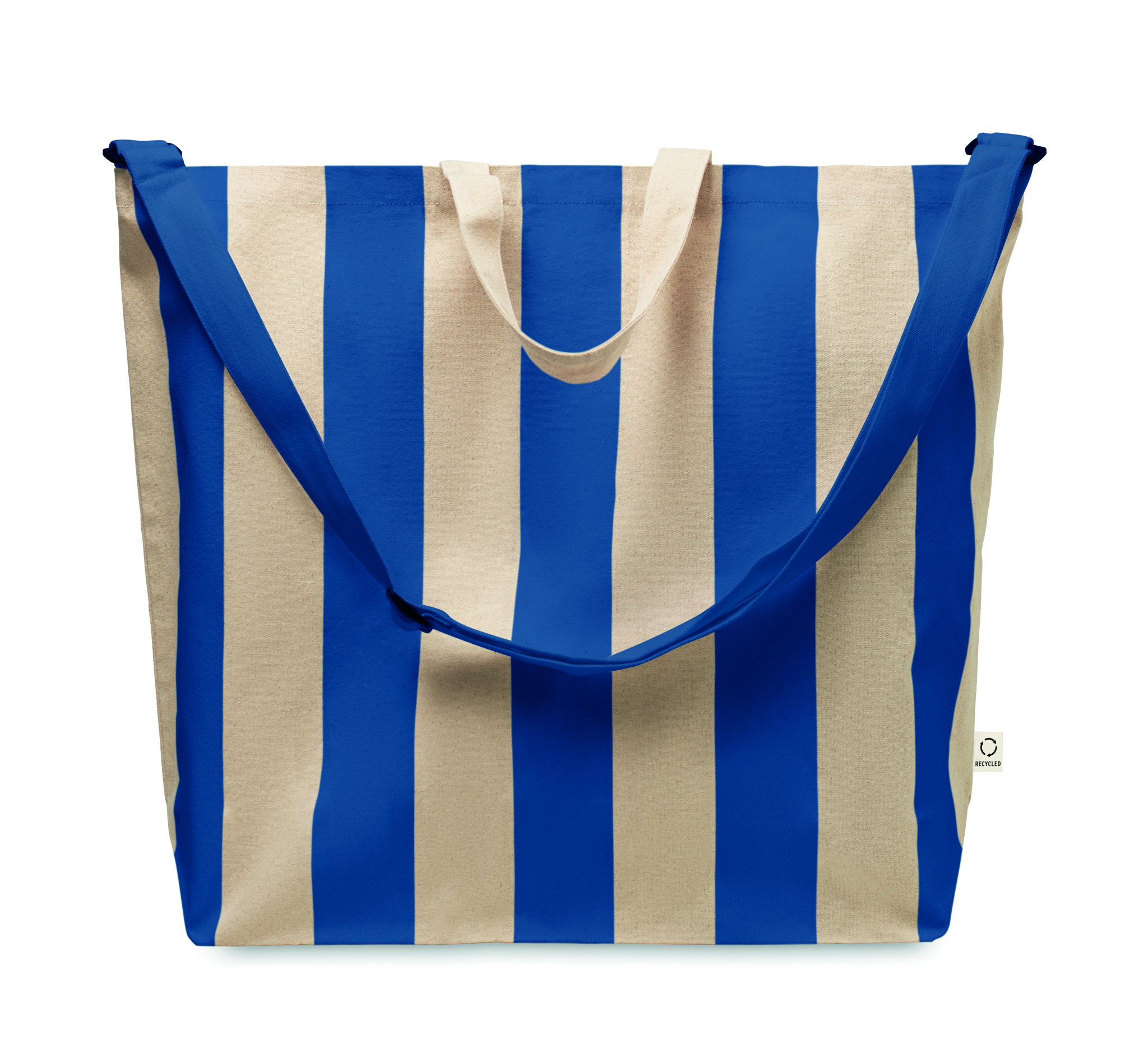 Eriti suur sisetaskuga triibuline rannakott 280 gr/m² taaskasutatud puuvillast (80%) ja taaskasutatud polüestrist (20%). Lühikesed käepidemed ja üks suur reguleeritav õlarihm.