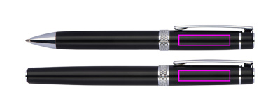 Kirjutuskomplekt, mis koosneb sinise kirjutussüsteemi täidisega keeratavast pastapliiatsist ja ümbrises olevast sinisest alumiiniumist rullpallist. Kroomrakendused ja sädelevad dekoratiivsed rõngad annavad komplektile elegantse välimuse. Teie logo graveeritakse mõlemale pliiatsile klambrist paremal.