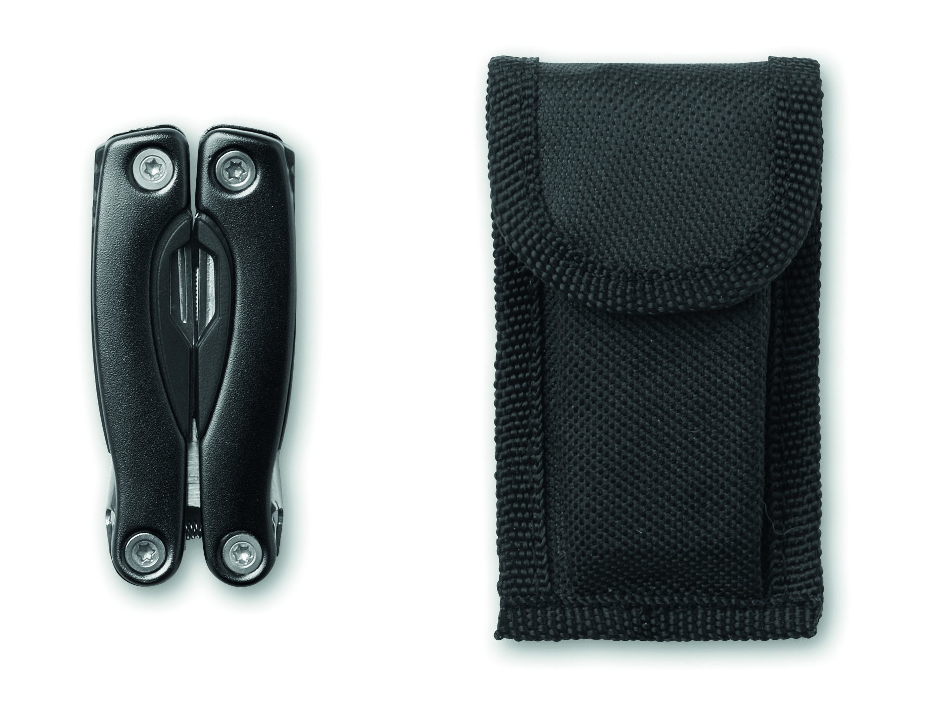 Roostevabast terasest kokkupandav multitööriist koos roostevabast terasest tangidega. 9 tööriista funktsiooni. Kaasas 600D polüesterkott.