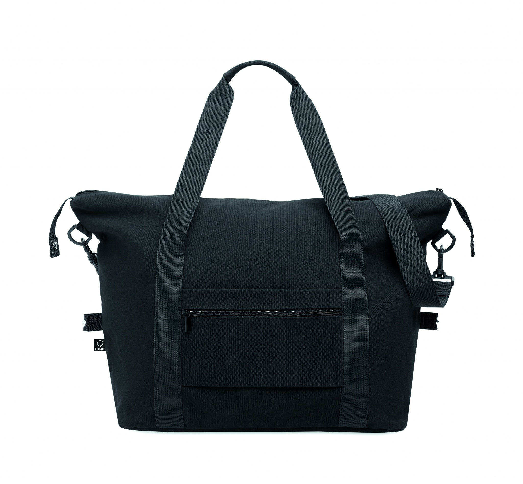 Nädalavahetusekott taaskasutatud tarbimiseelsest puuvillast ja taaskasutatud polüestrist (70%/30%), voodriga 210D RPET polüester. Sellel on eesmine tasku, lukuga tagatasku, eemaldatav ja reguleeritav õlarihm ning polsterdatud põhi. Käru hoidik tagaküljel.