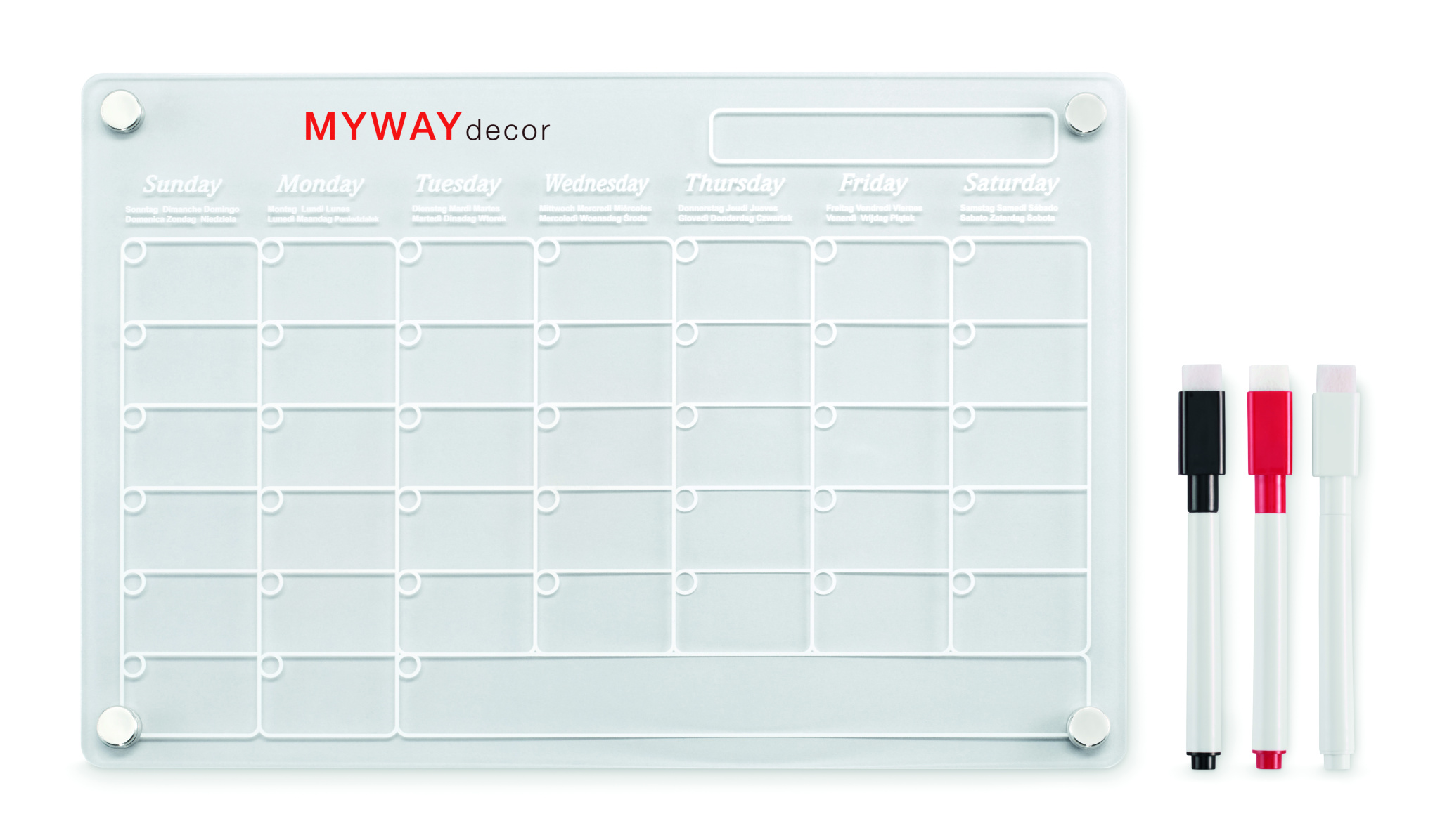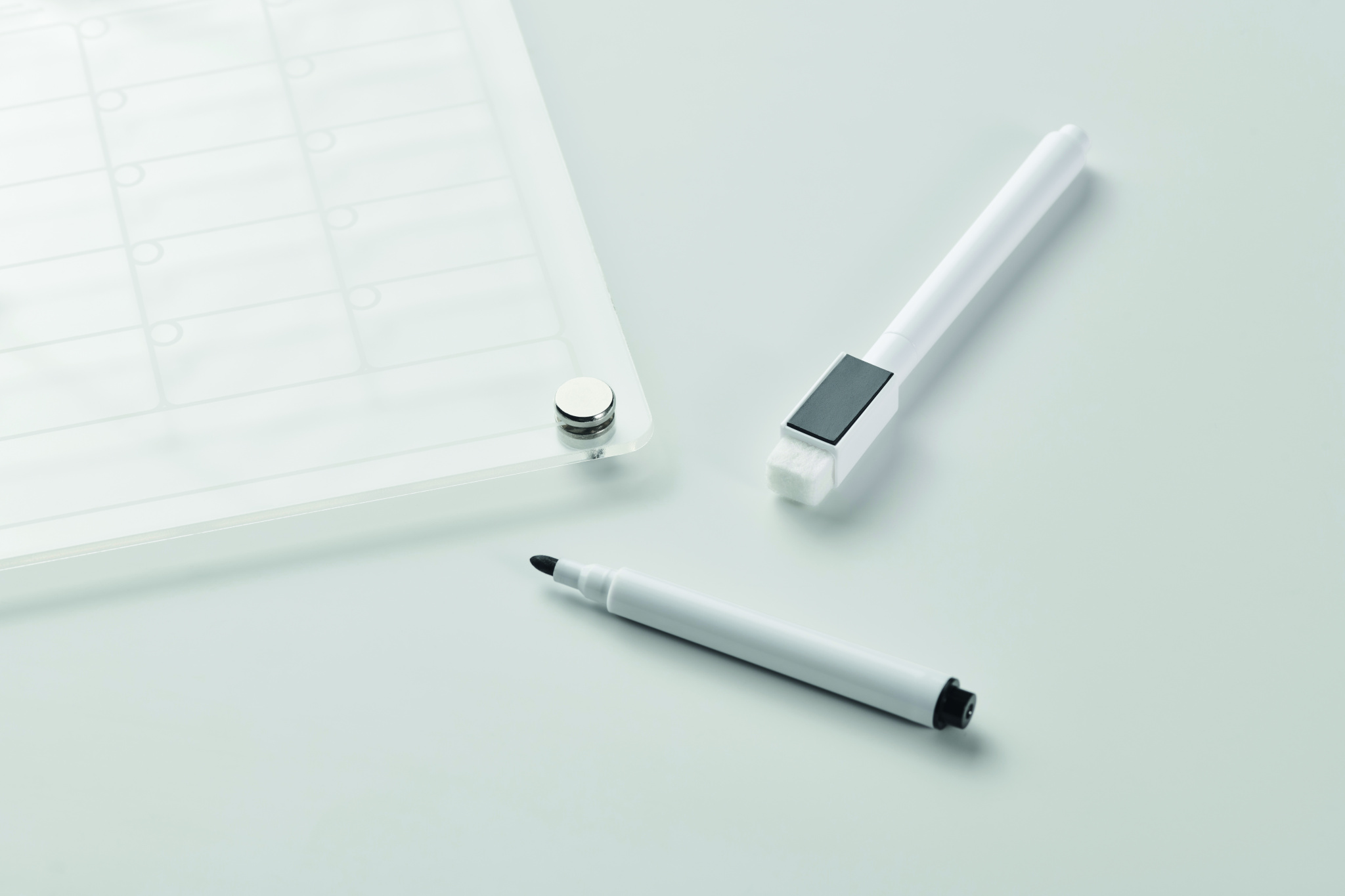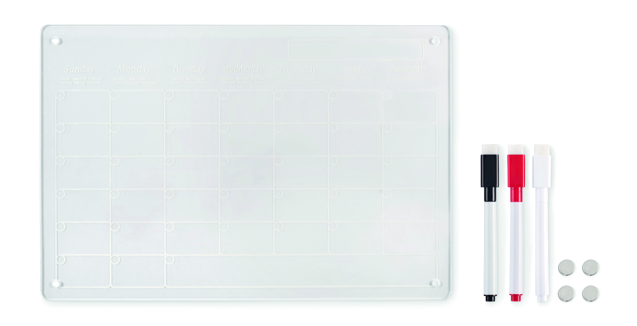 A4-formaadis magnetiline akrüülkuuplaneerija kolme kustutatava magnetilise markeriga (must, punane ja valge). Komplektis kruvid kinnitamiseks.