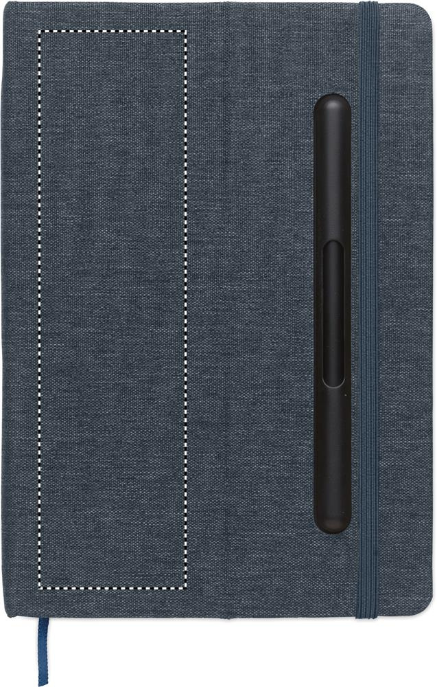 A5 märkmik RPET kõvade kaantega, millel on telefonihoidiku funktsioon. 2-ühes tindivaba ja tavaline ABS- pastapliiats. 192 taaskasutatud paberist lehekülge (96 lehte). Samas toonis kummipaela ja järjehoidjaga.