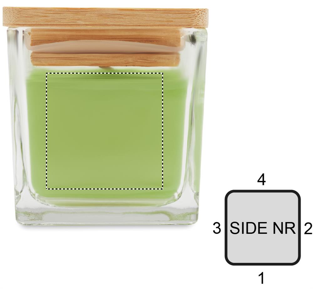 Aromaatne taimepõhine vahaküünal bambusest kaanega ruudukujulises klaasist hoidikus. 50 gr. Põlemisaeg: 8 tundi. Valge(06) vanill, kollane(08) sidrun, oranž(10) oranž, roheline(48) õun.