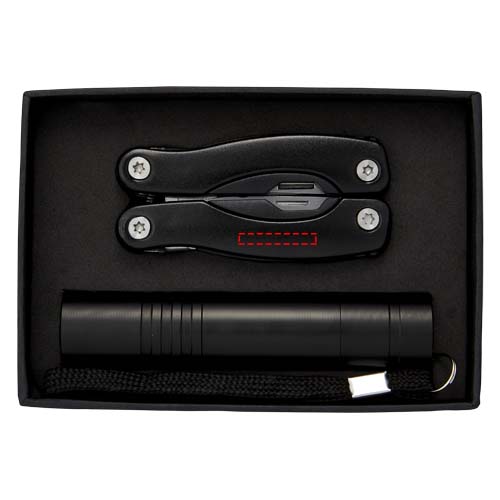 11-funktsiooniline mini-mitmetööriist LED-taskulambiga mustas kartongist kinkekarbis ja EVA sisestusega. Patareid kaasas. .