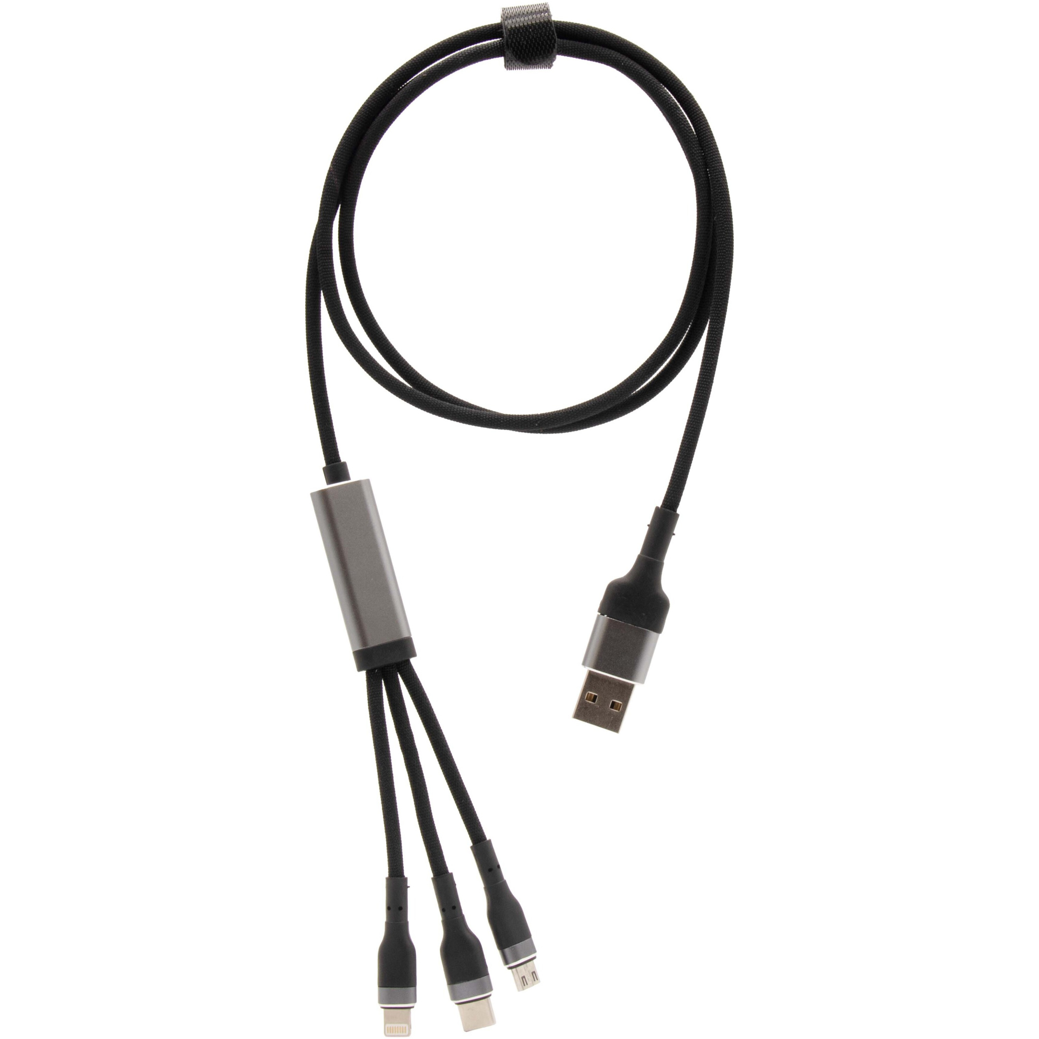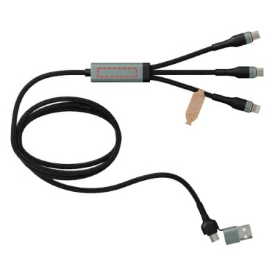 5-ühes ülikiire rPET 100 W ülikiire laadimiskaabel, millega saab laadida nutitelefone, tahvel- ja sülearvuteid. Kahekordne USB-A + USB-C sisend muudab kaabli 100% ühilduvaks uusimate arvutimudelitega. Väljund: Type-C, Micro USB ja Lightning. Tarnitakse taaskasutatava TPU koti ja taaskasutatud paberist vahetükiga. Kaabli pikkus: 1 meeter.