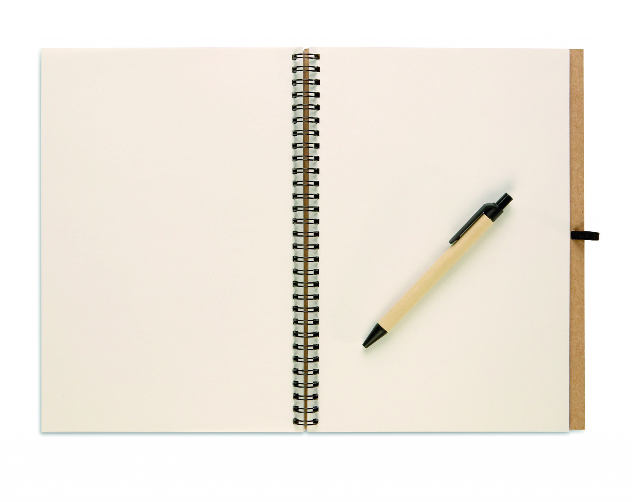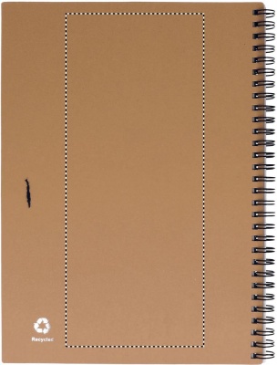 Taaskasutatud paberist märkmik pastakaga. Kahejuhtmeline. 140 tavalist taaskasutatud paberilehte (70 lehte). Nupuga pastapliiats taaskasutatud karbis ja biolagunevas plastis. Sinine tint. Must elastne pliiatsihoidja.