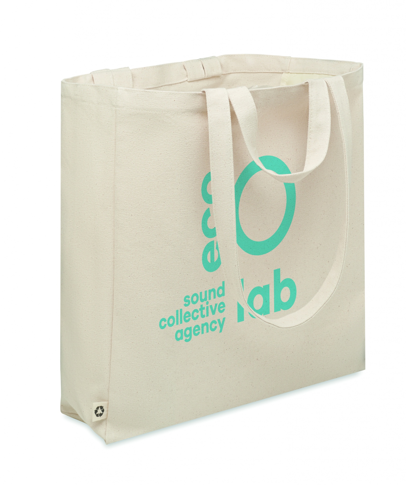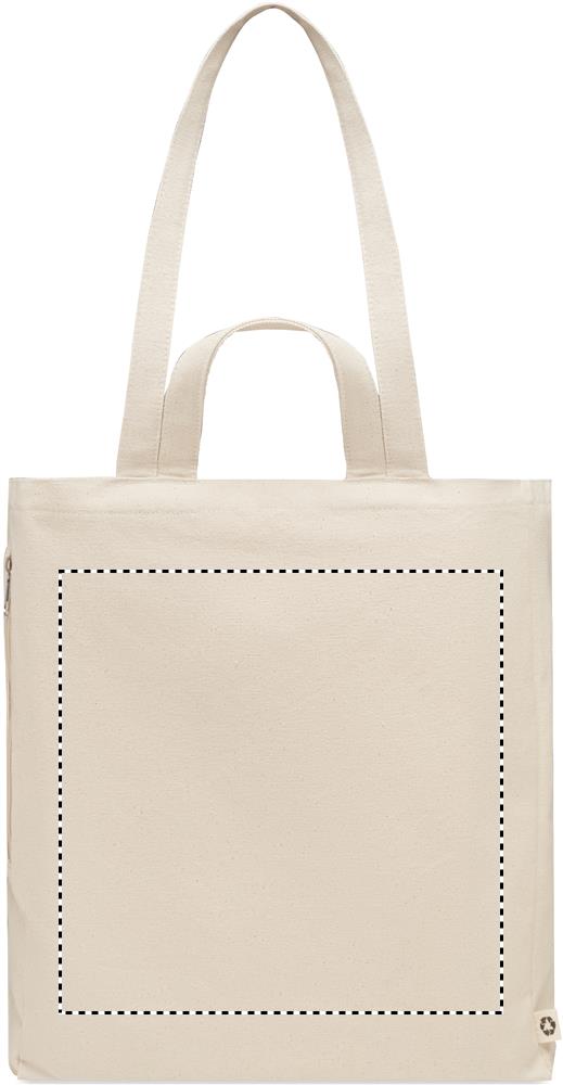 Taaskasutatud polüpuuvillasest ostu- või rannakott (70% taaskasutatud puuvill, 30% taaskasutatud polüester) lühikeste sangadega. Sellel on külgmine lukuga tasku. 380 gr/m².