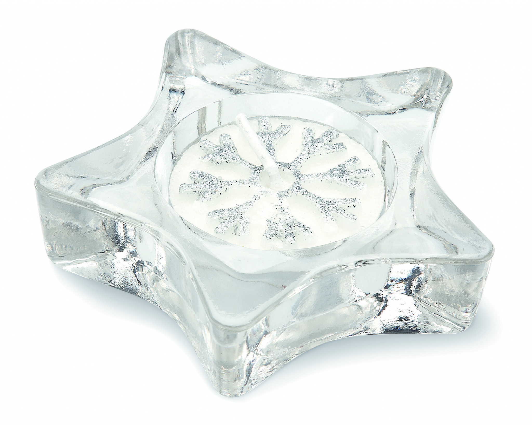 Tähekujuline klaasist teeküünlaalus läbipaistva katte ja dekoratiivpaelaga hõbedases karbis. Komplektis teeküünla.