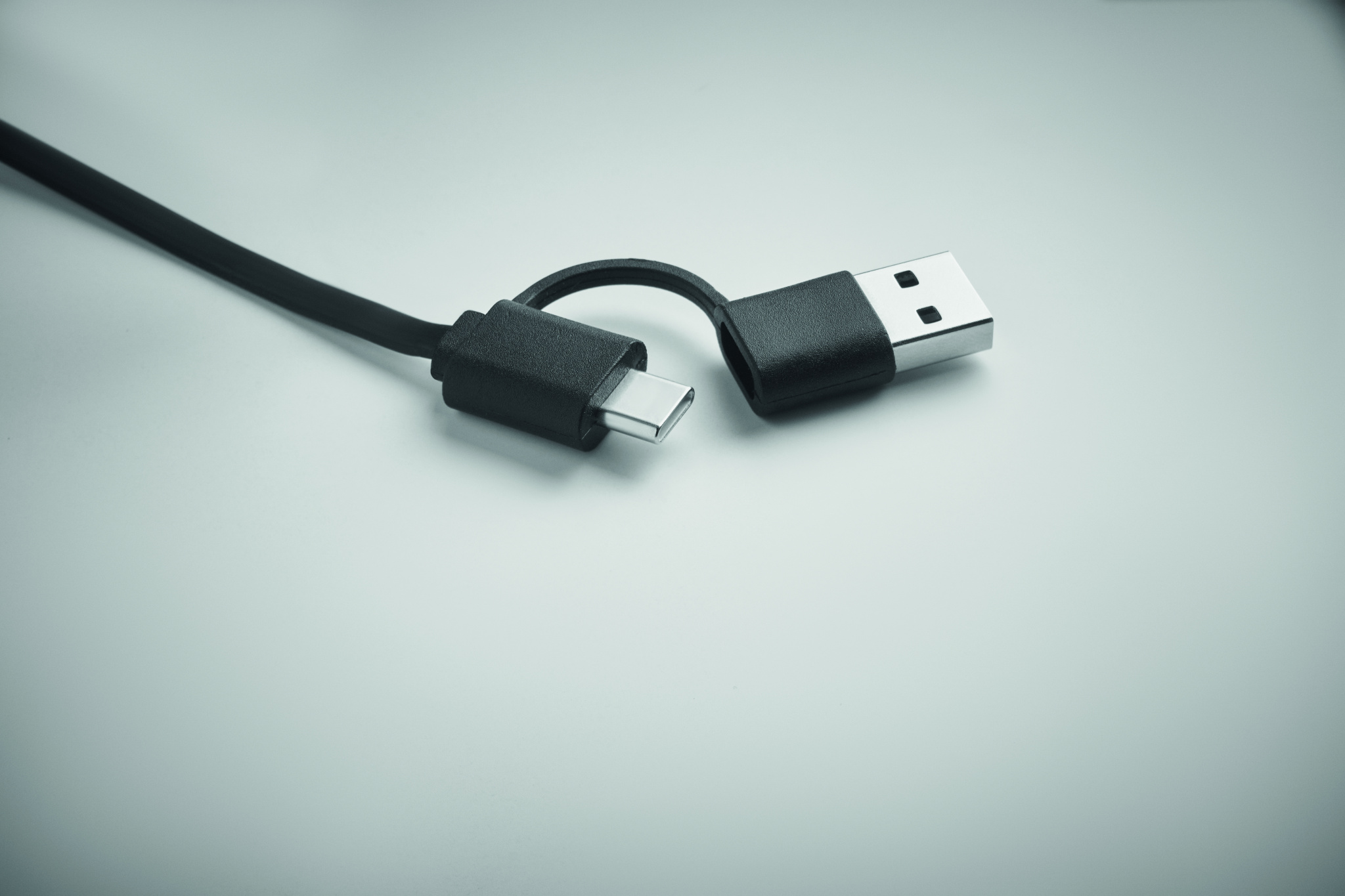 60 W sisäänvedettävä kaapeli kierrätetyssä ABS-kotelossa. Tulo: 2-in-1 Type-C ja Type-A. Lähtö: Type-C ja micro-B (2 in 1 pin). Kaapelin pituus: 80 cm.