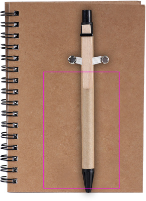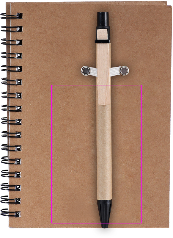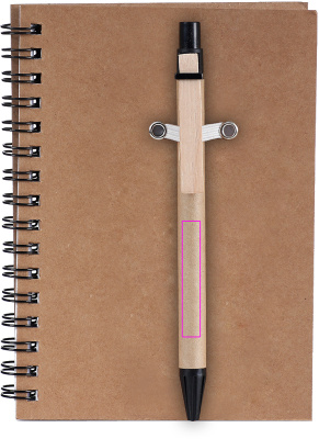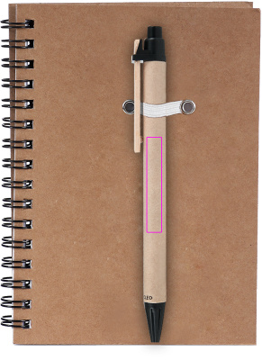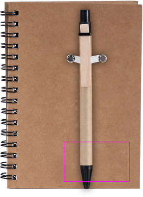 Muistilehtiö kierrätyspahvista, jossa on 120 sivua kierrätyspaperia ja sinisellä musteella kuulakärkikynällä. Painamme logosi kanteen.
