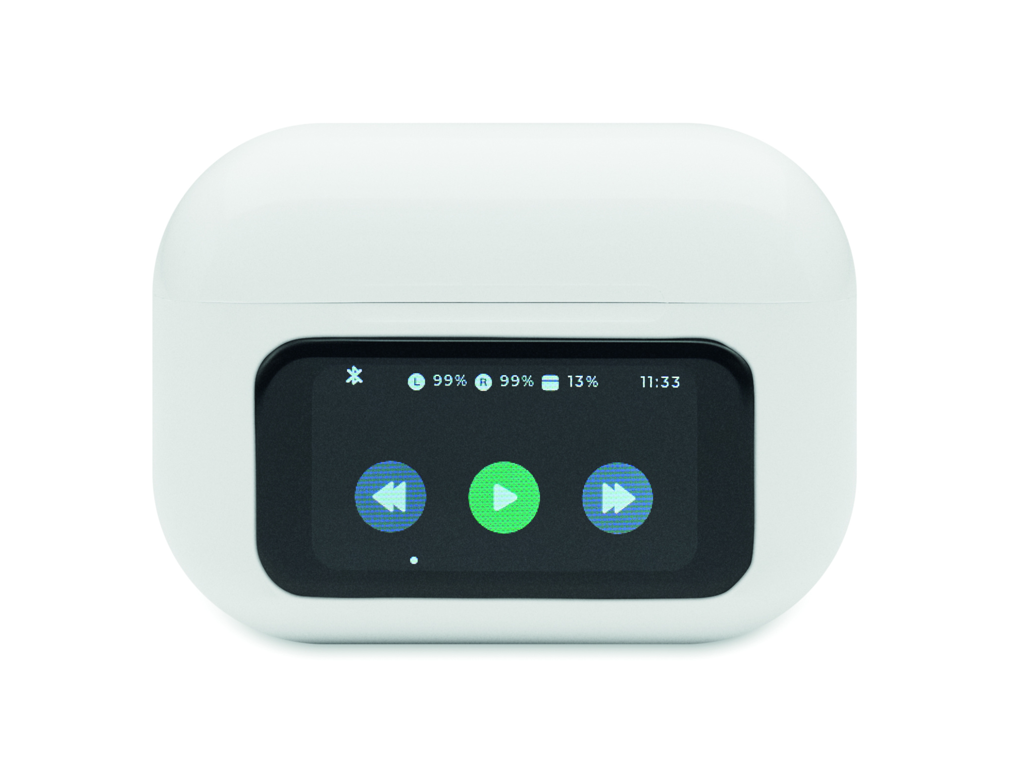 Kierrätetystä ABS-muovista valmistetut langattomat True Wireless Stereo (TWS) 5.0 -stereonappikuulokkeet (30 mAh), joissa ANC/ENC ja mikrofoni sekä 230 mAh:n latausalusta. Kosketusnäyttö.
