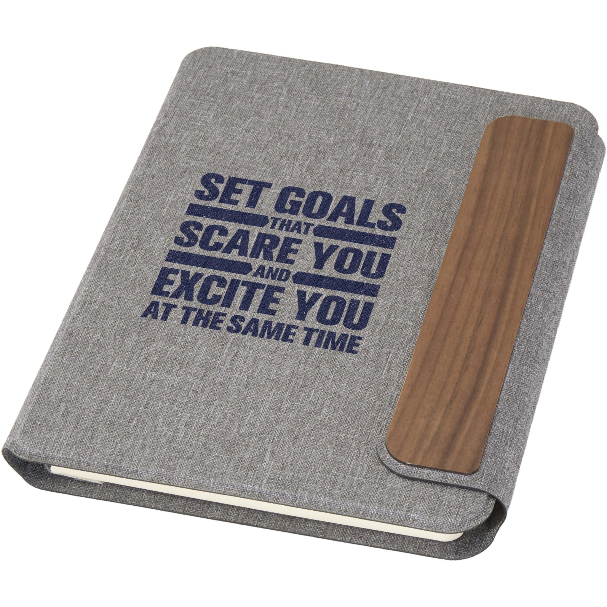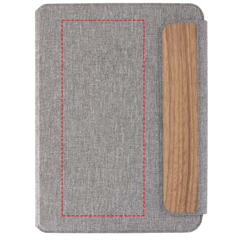 A5-kokoinen Andean-portfolio on valmistettu osittain RCS-sertifioidusta kierrätetystä polyesteristä, mikä tarjoaa kestävämmän vaihtoehdon vähentämällä kokonaan uusien materiaalien käyttöä. Tyylikkäissä, harmaissa, kovissa kansissa on pyöristetyt kulmat, ja ne on tehty tarkkuushitsaustekniikalla. Portfolio kiinnitetään magneettisella sulkimella, jota korostava hienostunut, pähkinäpuinen yksityiskohta lisää modernia ja hienostunutta ilmettä. Sisäpuolella on irrotettava pehmeäkantinen muistikirja, jossa on 64 kermanväristä, viivoitettua arkkia. Muistikirja on valmistettu vastuullisesti hankitusta 80 g/m²:n paperista. Toimitetaan voimapaperin värisessä paperitaskussa.
