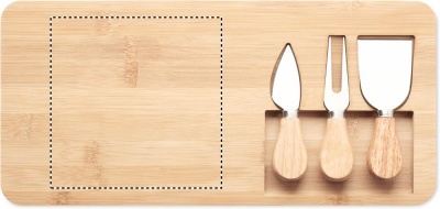 Bambuinen juustolauta, sisältää 2 erilaista juustoveistä ja tarjoiluveitsen. Luonnollisen materiaalin (bambu) vuoksi, tuotteiden värissä/ koossa saattaa olla erinäisyyksiä ja tämä voi vaikuttaa painatuksen lopputulokseen.