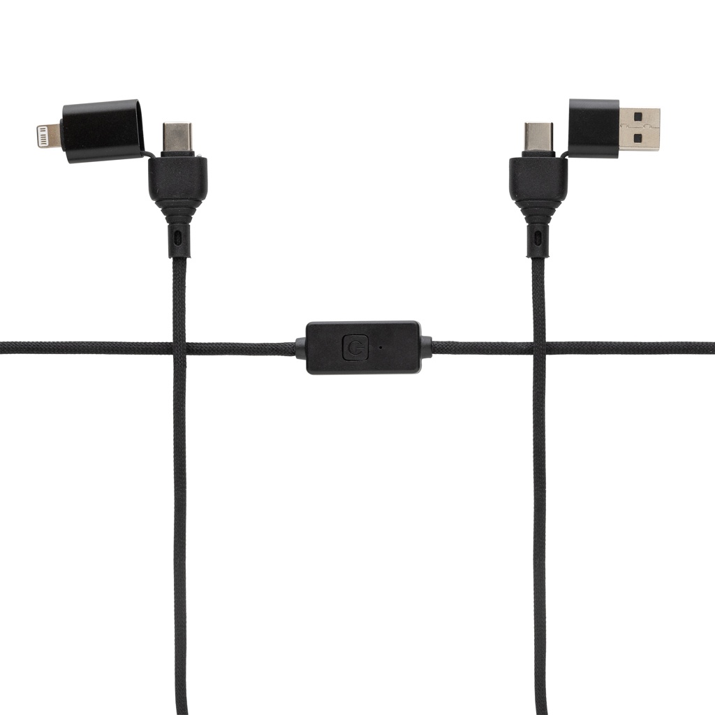 60W lataus- ja datakaapeli, jolla voit ladata kaikki mobiililaitteesi huippunopeudella ja joka tukee jopa kannettavan tietokoneen latausta. Kaapelissa on ainutlaatuinen integroitu painike, jolla voit kytkeä tiedonsiirtotoiminnon pois päältä kun käytät kaapelia julkisesti välttääksesi tietovarkaudet, ja estääksesi hakkerien pääsyn käsiksi puhelimeesi. Aktivoi suojaustila yksinkertaisesti painamalla painiketta. Kaapeli on valmistettu kierrätetystä TPE:sta, PET -sekä ABS muoveista, ja kierrätetystä alumiinista. 120 cm pitkä kaapeli tukee Car playtä ja Android autoa (vain C-tyyppi C-tyypille) . Kokonaisuudessaan kierrätettyä sisältöä: 52 % tuotteen kokonaispainon perusteella. RCS-sertifiointi takaa täysin sertifioidun toimitusketjun kierrätysmateriaaleille. Pakattu FSC-sekoituspakkaukseen. PVC-vapaa.