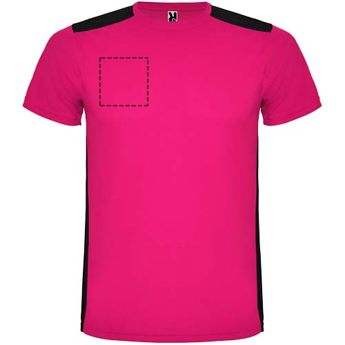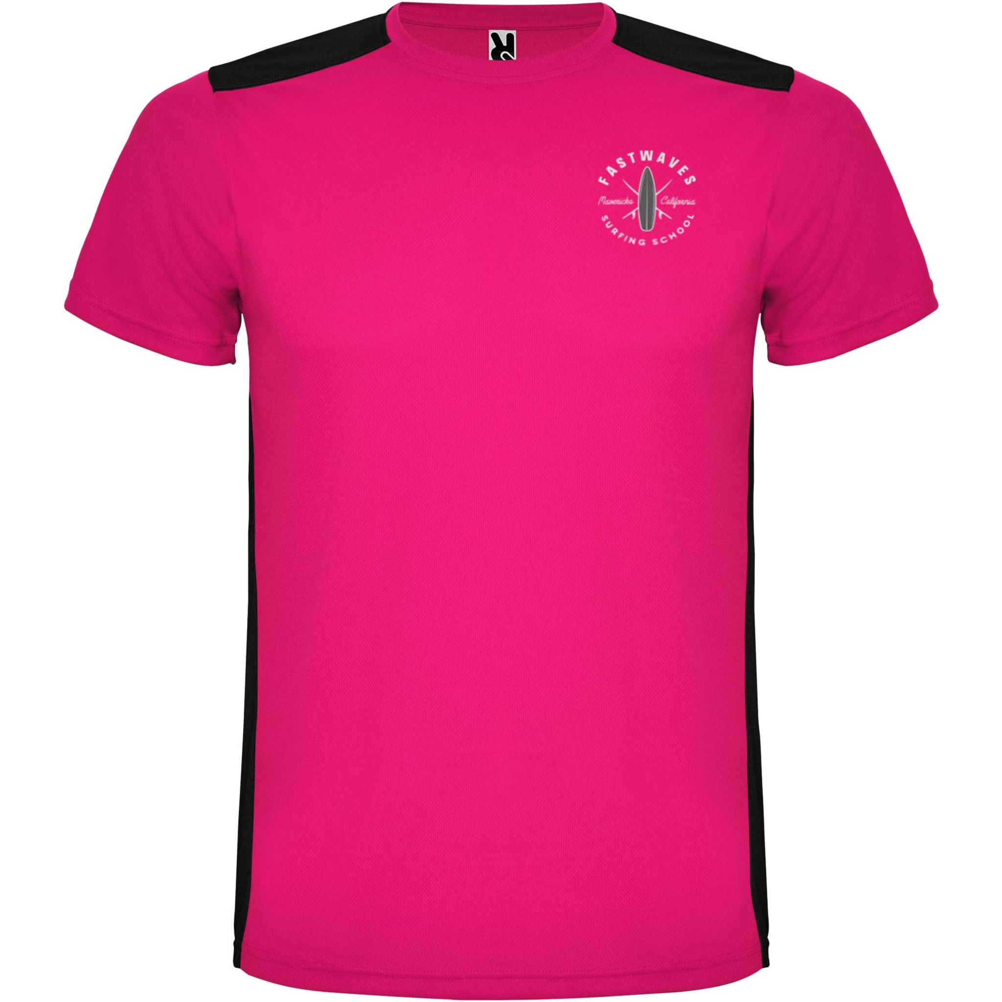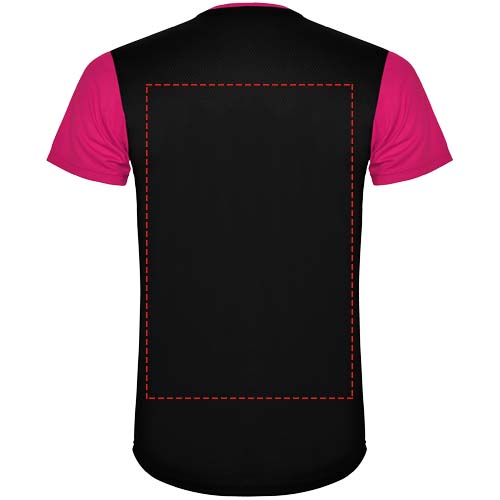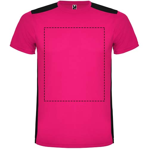 Helposti kuivuva, tekninen ja hengittävä kangas. Pyöreä kaula-aukko. Kahden polyesterikankaan yhdistelmä selässä ja olkapäissä. Bird's eye -kangas edessä ja hengittävä 3D-verkkokangas takana. Kangas, joka on suunniteltu imemään kosteutta. Sivuilla ja olkapäillä koristeellinen siksak-selkätikki. Selkäosa hieman pidempi. Irrotettava etiketti.