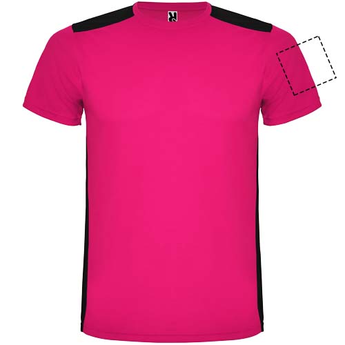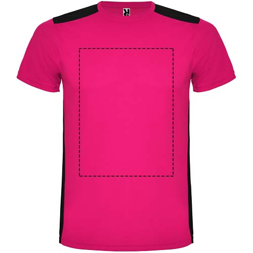 Helposti kuivuva, tekninen ja hengittävä kangas. Pyöreä kaula-aukko. Kahden polyesterikankaan yhdistelmä selässä ja olkapäissä. Bird's eye -kangas edessä ja hengittävä 3D-verkkokangas takana. Kangas, joka on suunniteltu imemään kosteutta. Sivuilla ja olkapäillä koristeellinen siksak-tikki. Selkäosa hieman pidempi. Irrotettava etiketti.