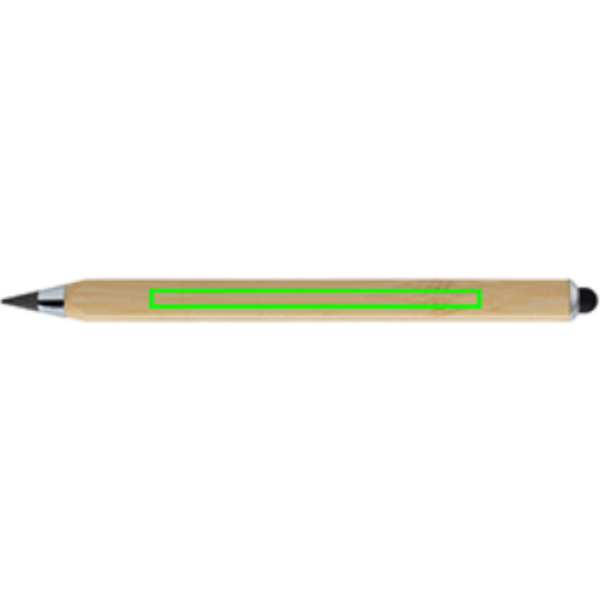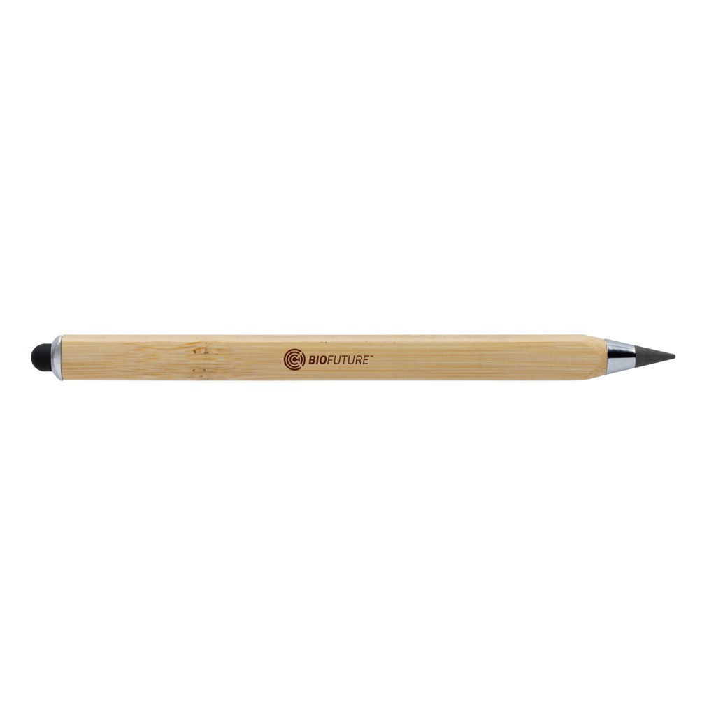 Nykyajan infinity-kynä, joka on valmistettu FSC® 100% -sertifioidusta bambusta. Kolmionmuotoinen runko, jossa yhdellä sivulla on CM-merkintä ja toisella sivulla tuuman merkintä. Perinteiset puukynät kirjoittavat vain noin 200 metriä, mutta tämä puuton infinity-kynä, joka käyttää grafiitin kärkeä tuottaakseen grafiittiviivan, voi kirjoittaa jopa noin 20 000 metriä. Se ei ainoastaan kirjoita kuin tavallinen puukynä, vaan merkinnät voidaan myös pyyhkiä pois. Se toimii jättämällä grafiittiviivan paperille aivan kuten perinteinen puukynä, mutta kuluminen on niin hidasta, että se kestää jopa 100 perinteistä puukynää! Siinä on kosketuskärki mobiililaitteen käyttöä varten. Pakattu FSC®-sekoitusmateriaalista valmistettuun pakkaukseen.