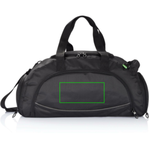 Vetoketjullinen lokeroitu etutasku, sivutasku, kenkätasku, kantokahvat ja olkaremmi, pohjassa 4 jalkaa, 600D ribstop -materiaalia. Ei sisällä PVC:tä.