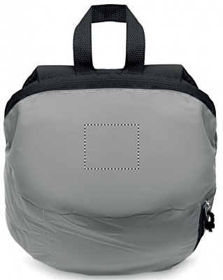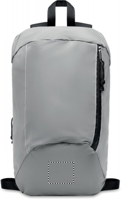 Heijastava reppu 600D polyesteristä. Repussa on vetoketjullinen päällitasku ja pehmustettu selkäosa.
