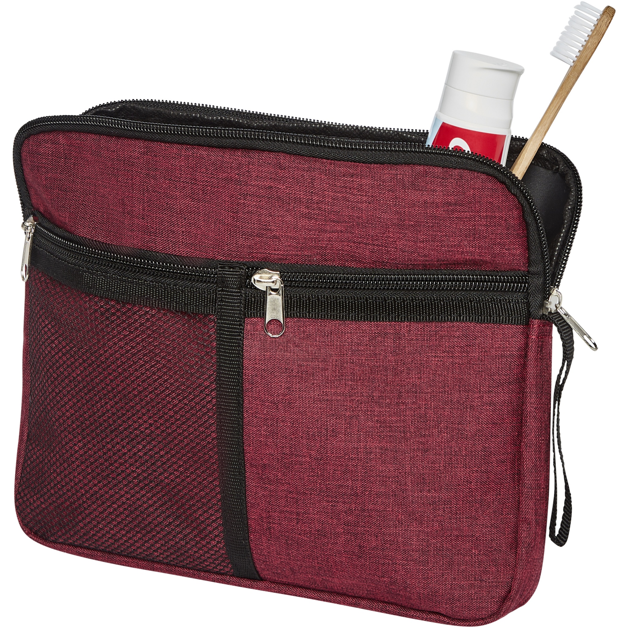 Hygienialaukku, jossa vetoketjullinen päälokero, kanervanvärisellä tehosteella. Siinä on kaksi pientä etutaskua (1 verkko ja 1 tavallinen). Varsinaisen tuotteen väri saattaa vaihdella hieman kangasvärien, kudonnan ja painatusten vuoksi.