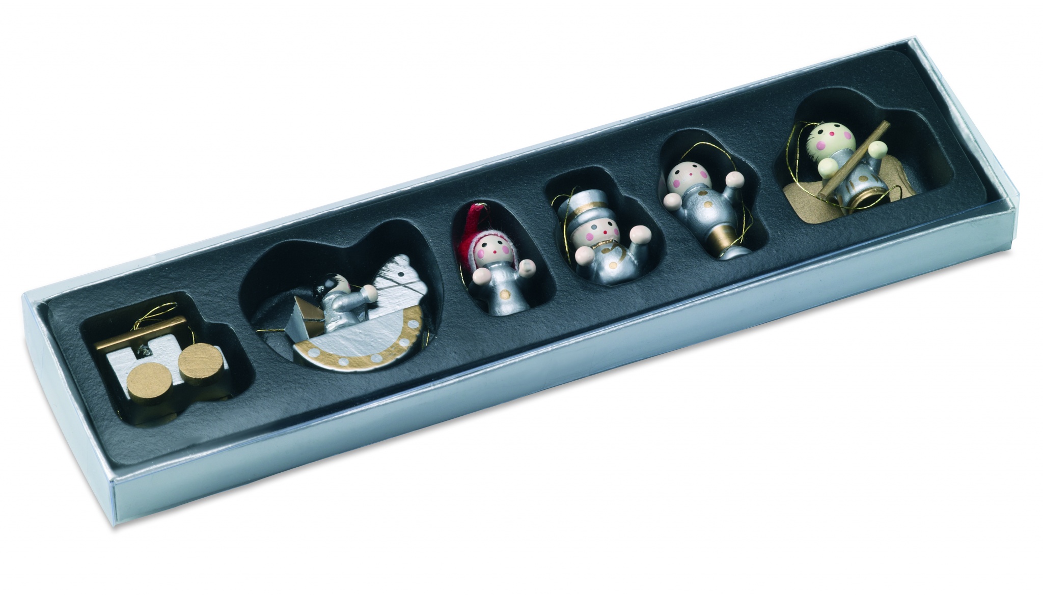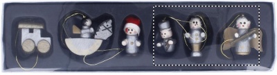 6 kpl joulukoristesetti, pakattuna kartonkiseen laatikkoon läpinäkyvällä kannella.