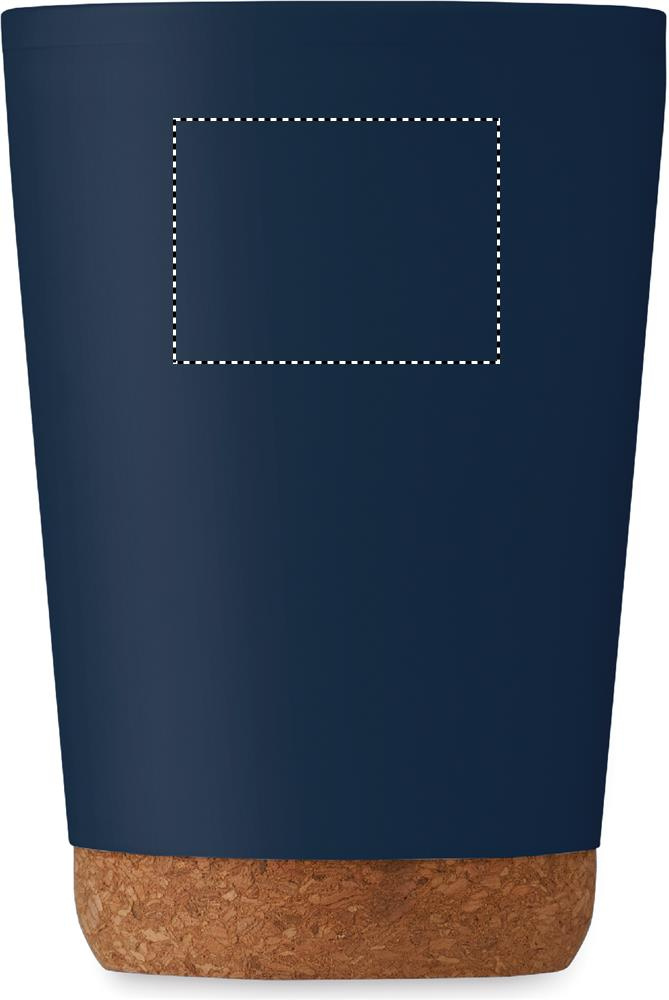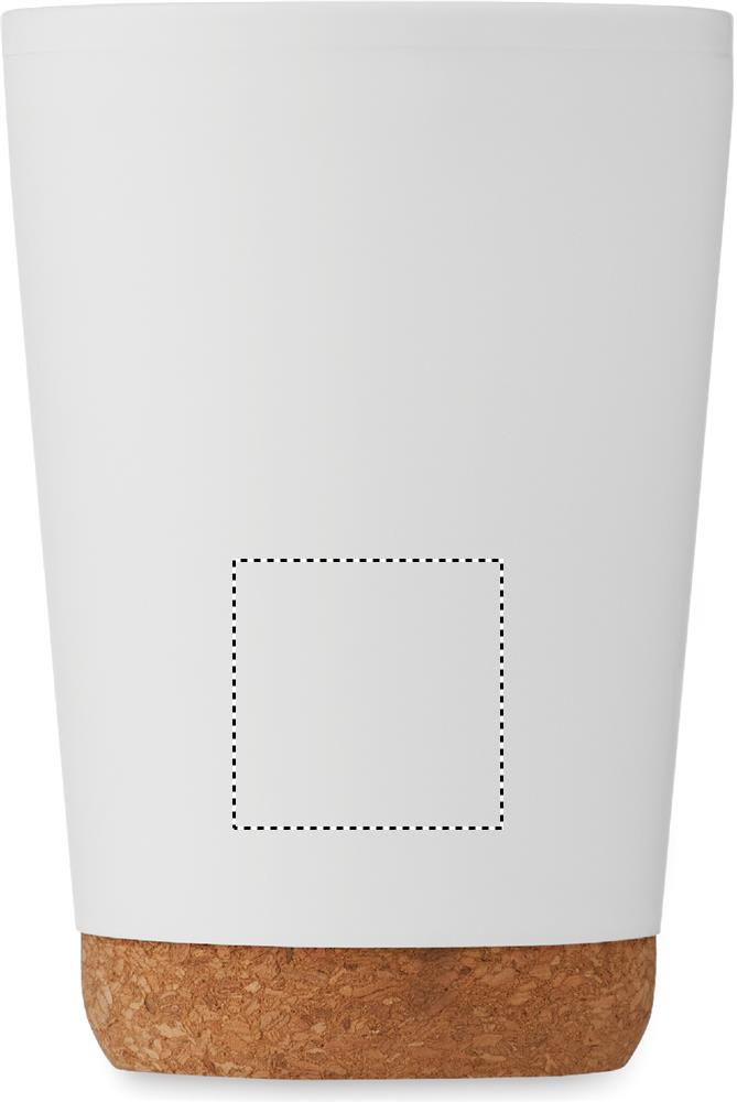 Kaksiseinäinen juomalasi PP-materiaalia, korkkipohja ja liukusuljettava juomasuukappaleen kansi PS- ja ABS-materiaalia. Tilavuus: 300 ml.